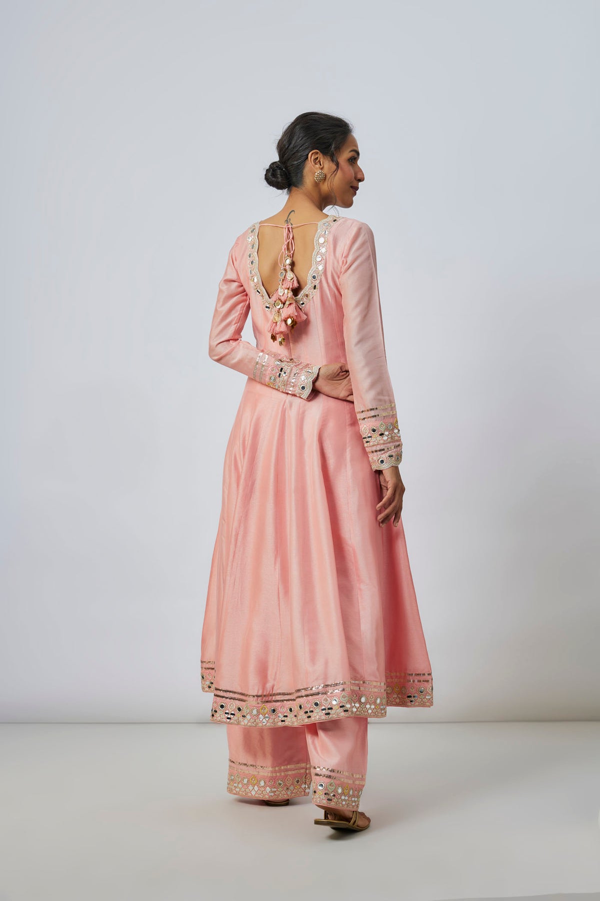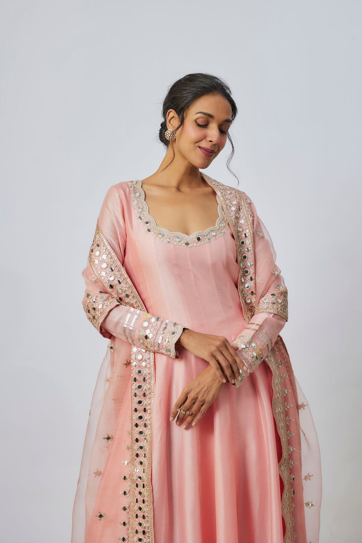 This kurta set features long A-line kurta with scalloped neckline and mirror work on hemline nand cuffs. Paired with straight-fit pants decorated with mirror work on the hem. Completing the look is a dupatta with embroidered border and scattered mirror motifs