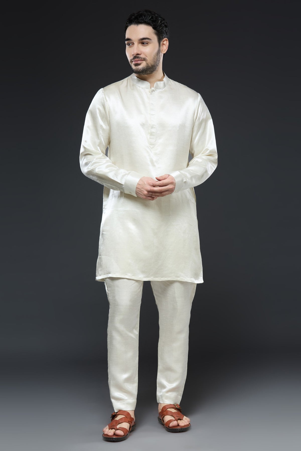 Yellow Linen Tissue Vest with floral hand painting and hand embroidery detailing, paired with Ivory kurta and slim pant