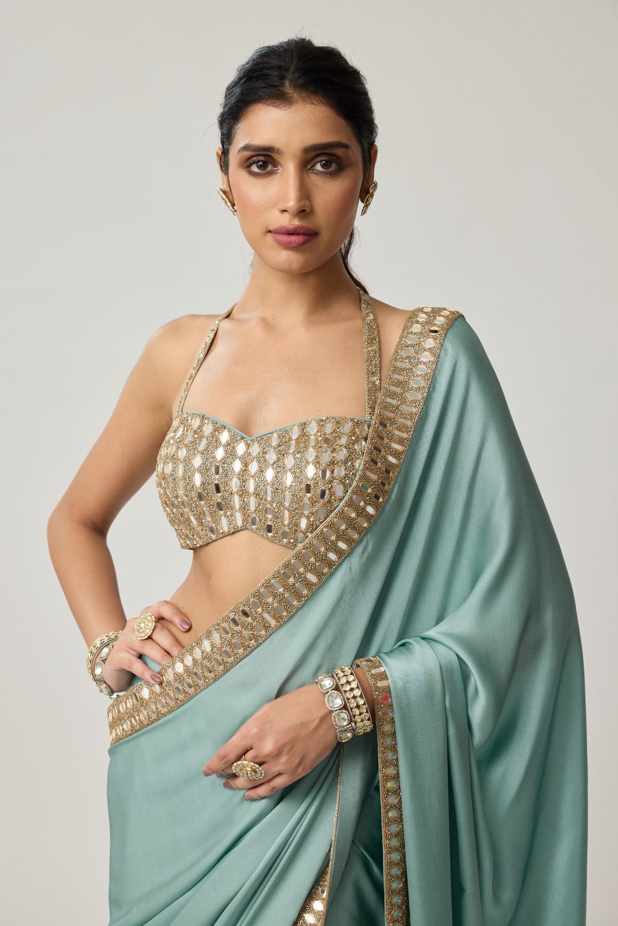 Powder Blue Satin Saree Clubbed with Real Hand Cut Mirror Embroidered Halter Neck Blouse.