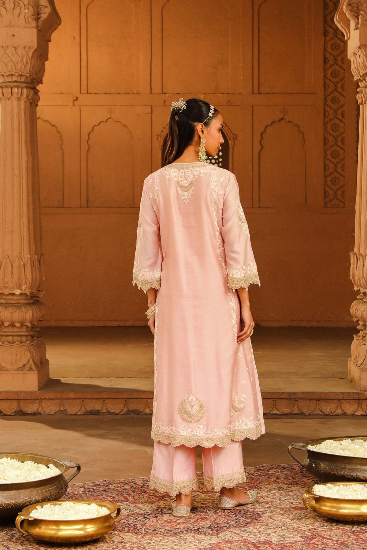The long A-line ensemble is made in pure silk chanderi fabric teamed up with a palazzo and a silk organza dupatta. The outfit is having a zero neck with placket and three-quarter sleeves. The outfit is adorned with Kashmiri tilla and parsi gara embroidery highlighted with basra moti. The whole outfit is finished with scallop detailing.