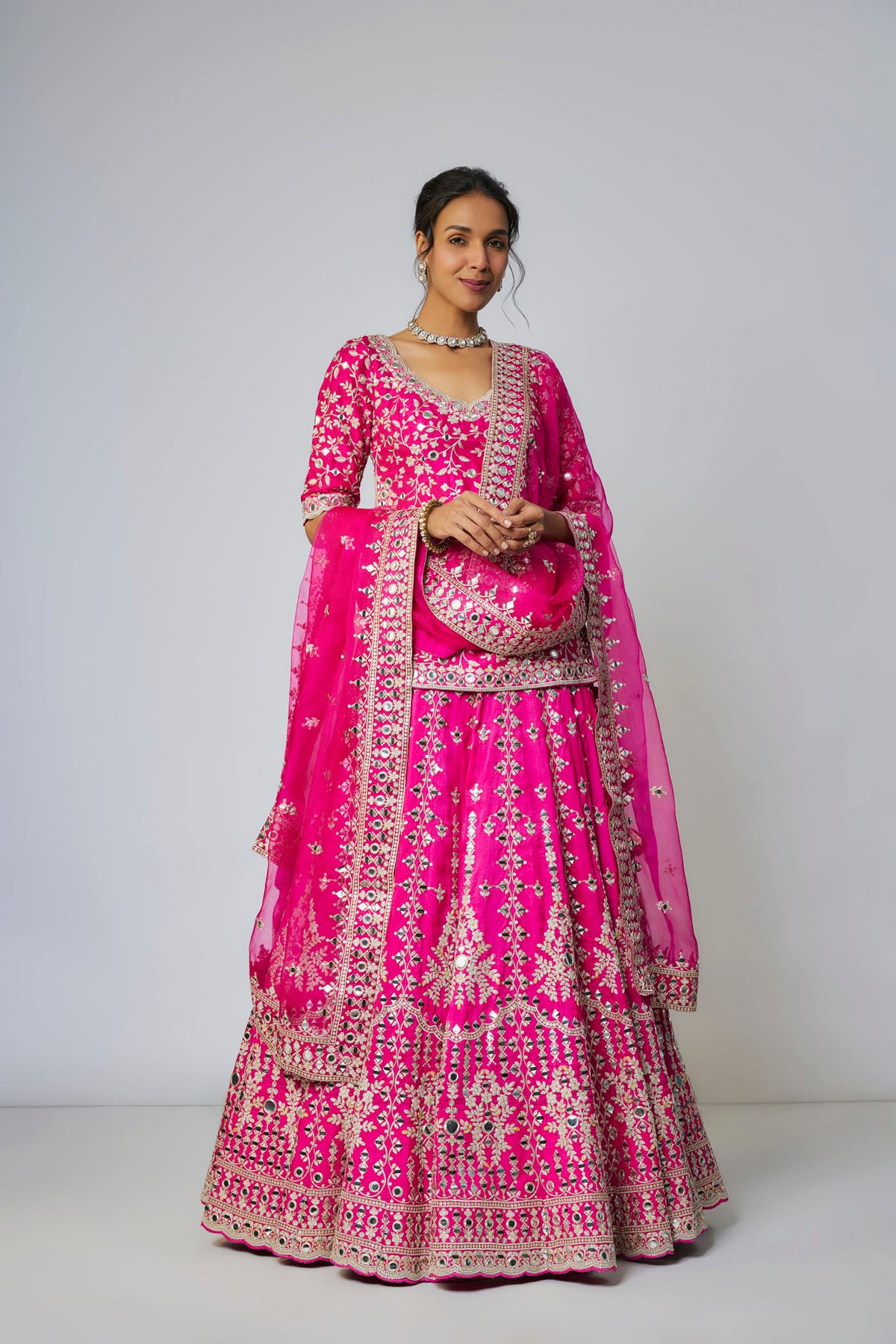 This traditional Indian lehenga intricately adorned with delicate embroidery in floral and geometric patterns. It is paired with a blouse embellished with complementary embroidery, completed with an organza dupatta, edged with intricate embroidery.