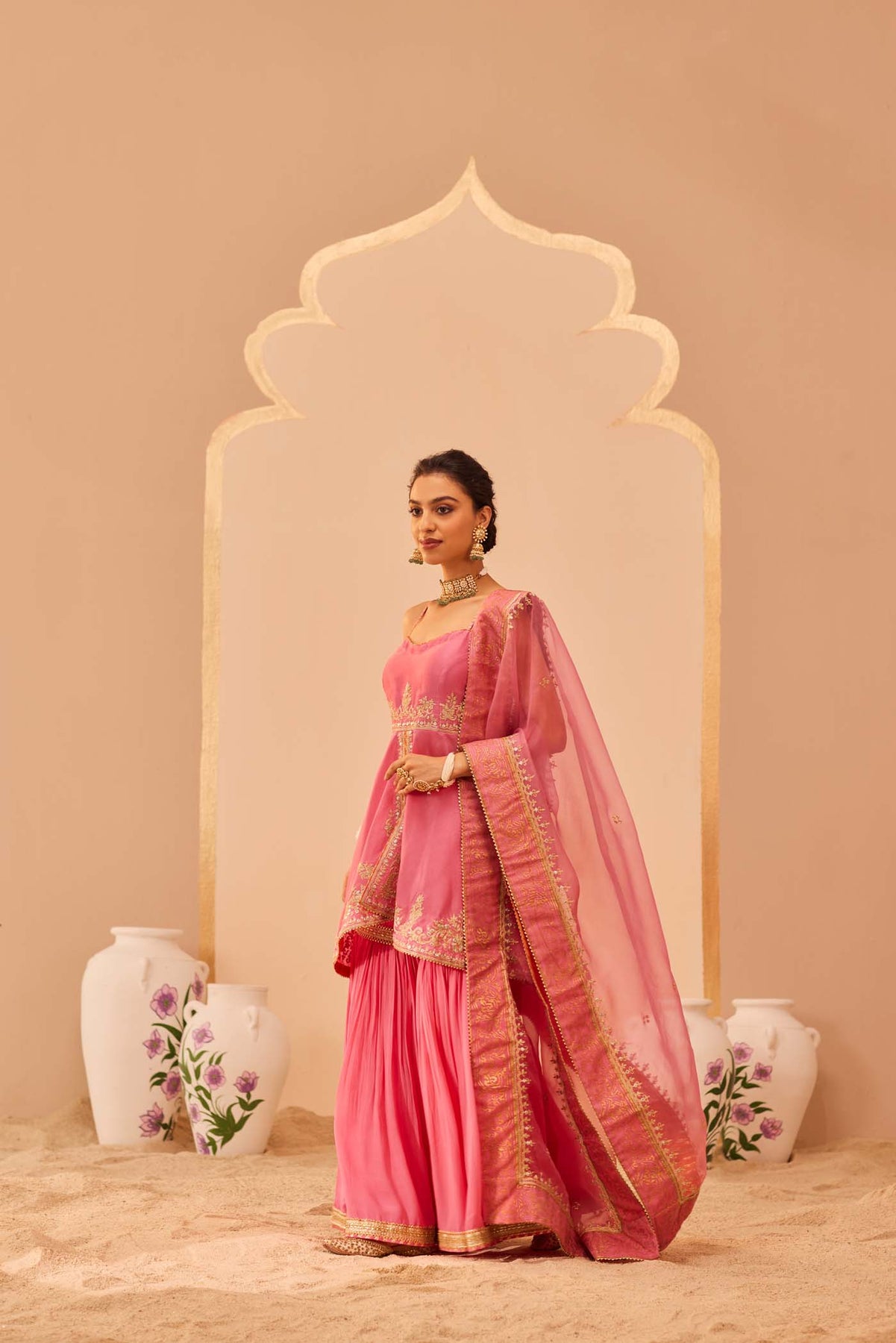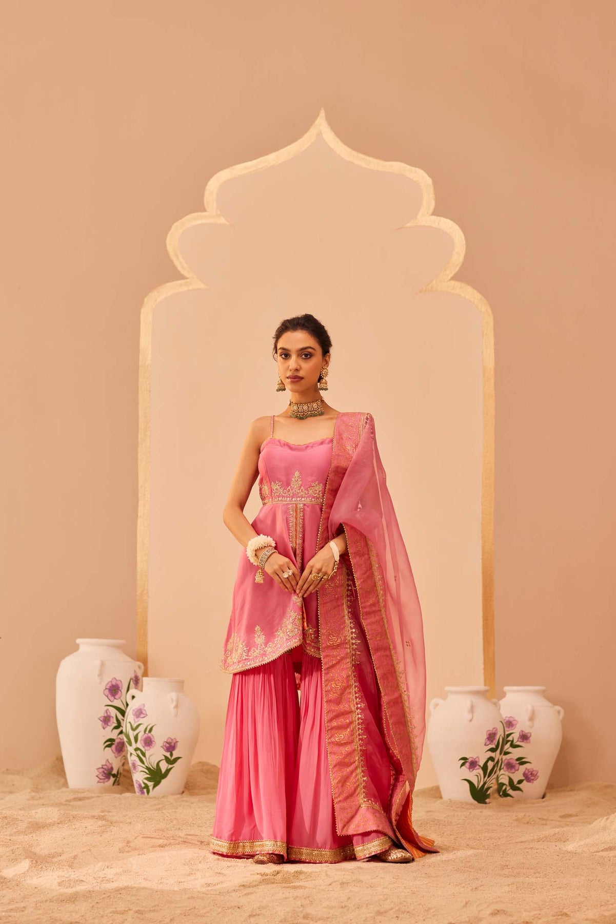 This ensemble is made in pure silk chanderi and georgette which are teamed up with a flowy silk organza dupatta. The kurta has embroidered straps with a delicate yoke. The outfit is adorned with a signature block print which is highlighted with tilla and patra embroidery. It is finished with a pure benarsi fabric and gota detailing.