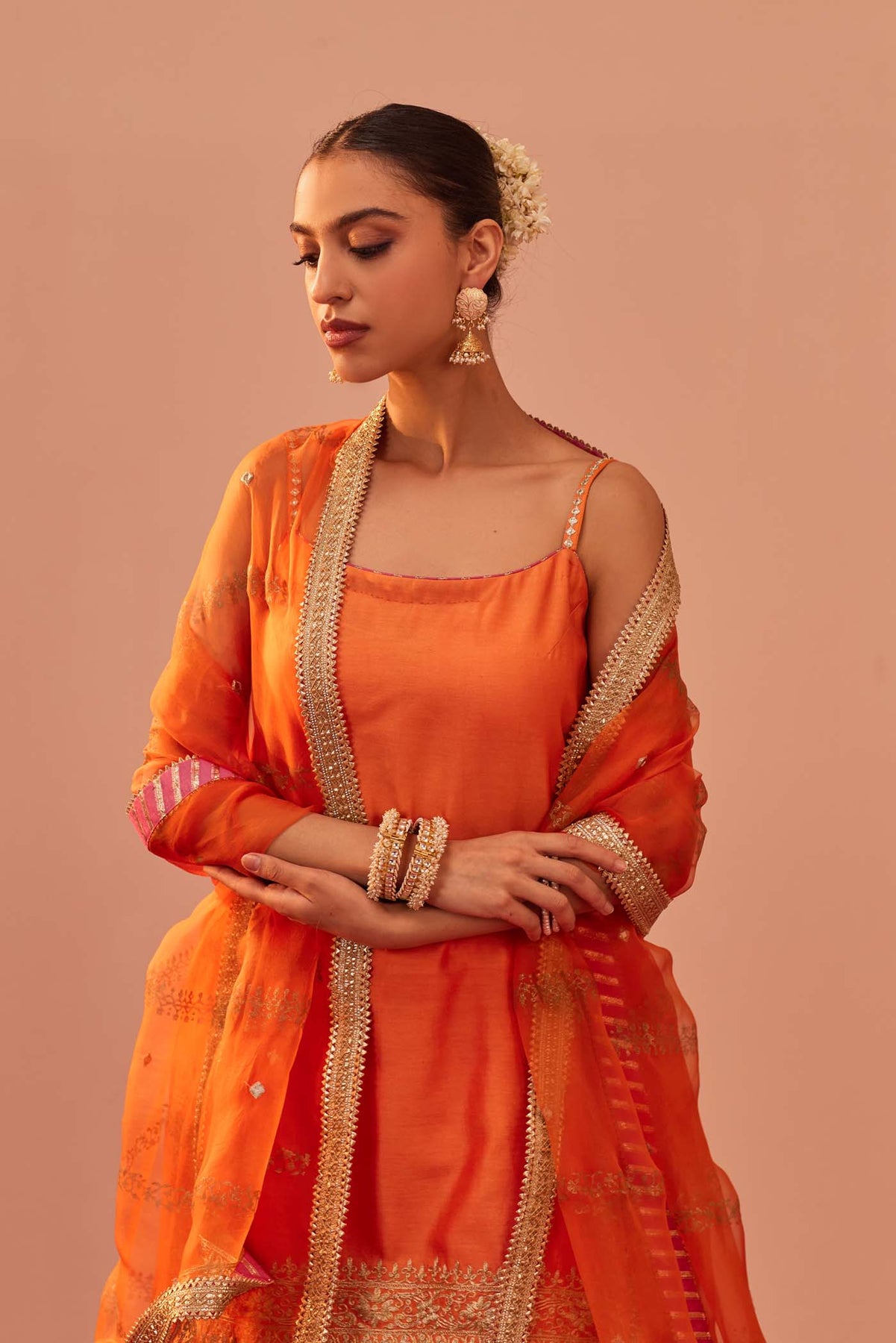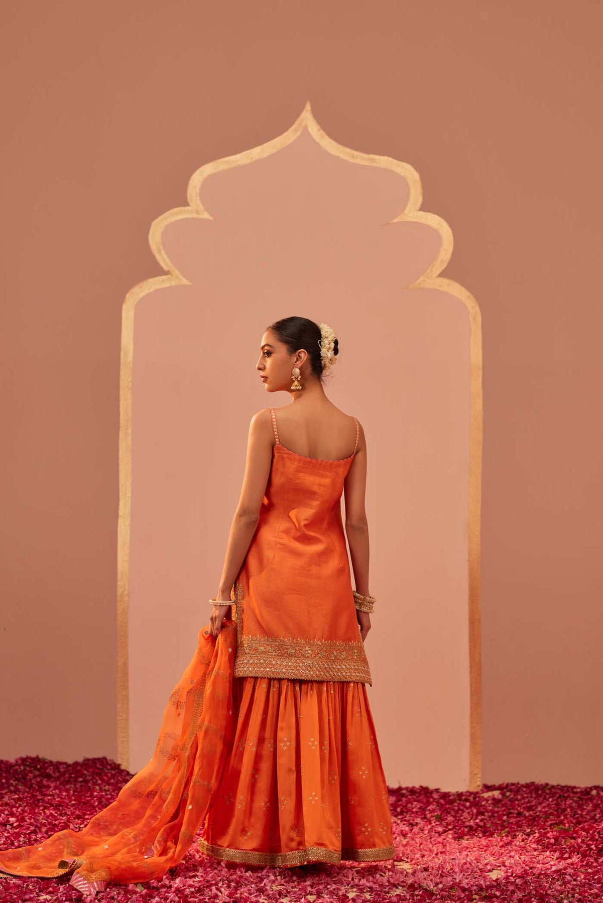 This ensemble is made in pure silk chanderi teamed up with an eccentric silk organza dupatta. The kurta has embroidered straps. The outfit is adorned with a signature block print which is highlighted with tilla and patra embroidery. It is finished with a pure benarsi fabric and gota detailing.