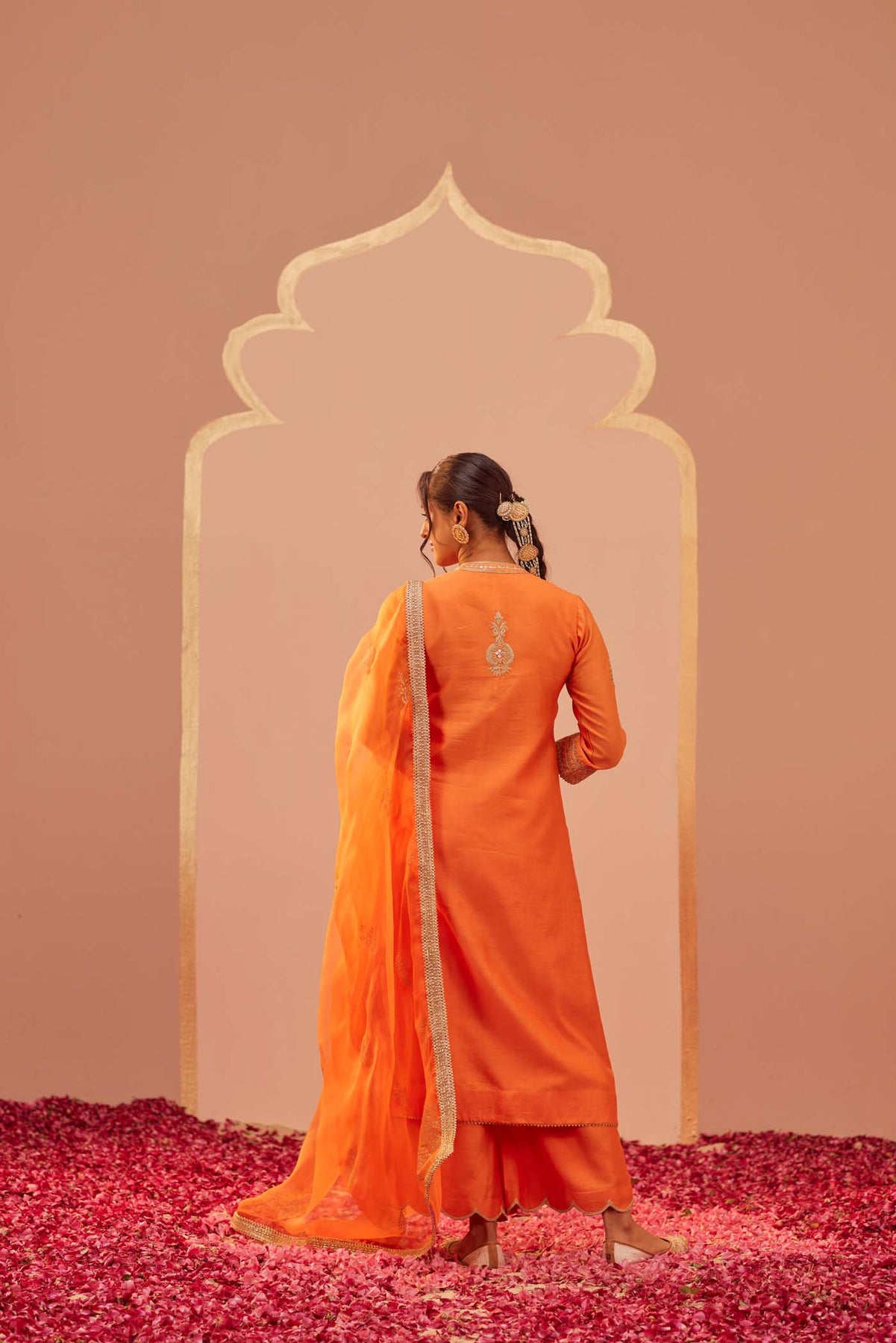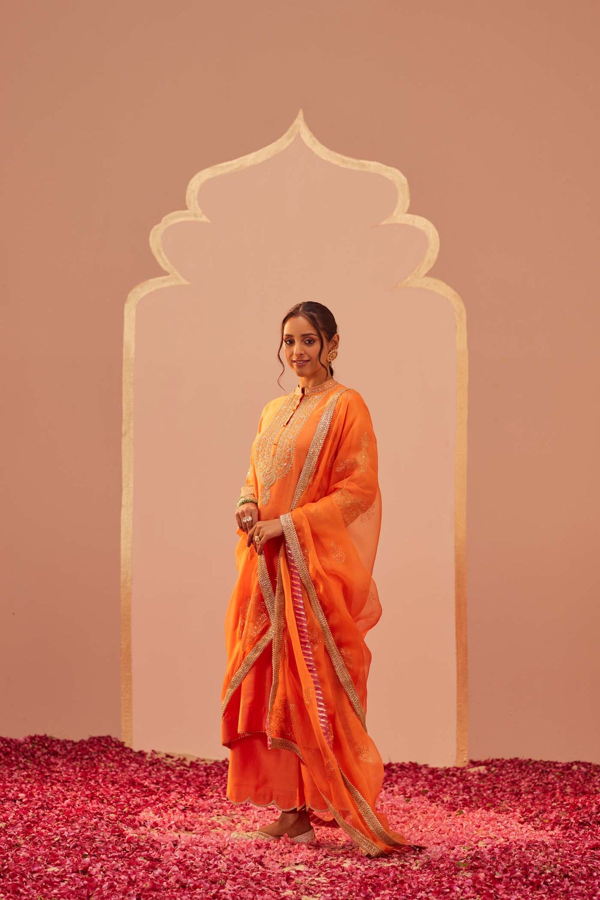 This ensemble is made in pure silk chanderi with a classic silk organza dupatta. The kurta has a chinese collar placket and three-quarter sleeves. The outfit is adorned with a signature block print which is highlighted with tilla and patra embroidery. It is finished with a pure benarsi fabric and gota detailing.