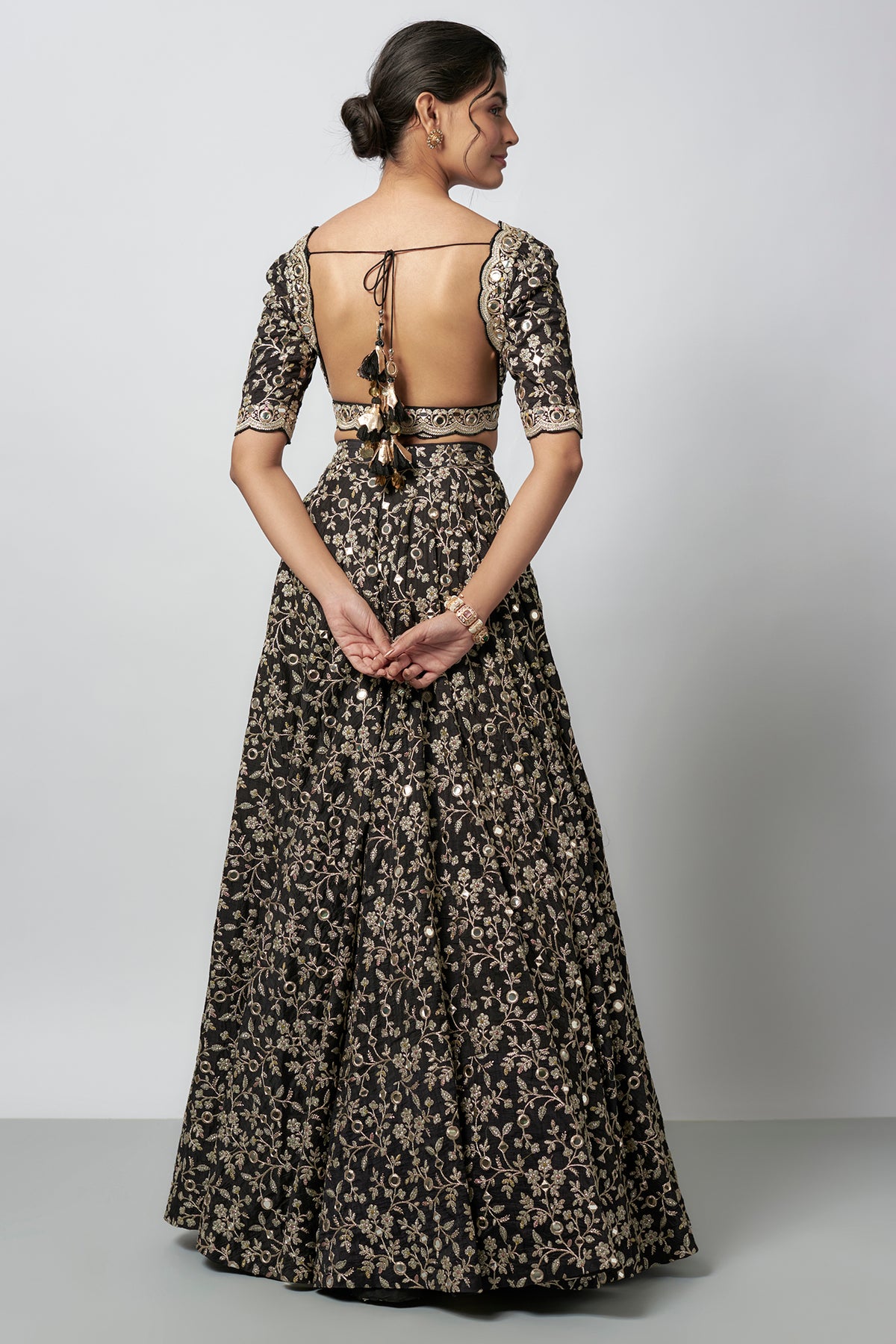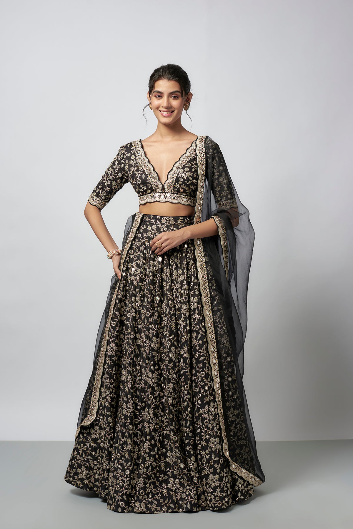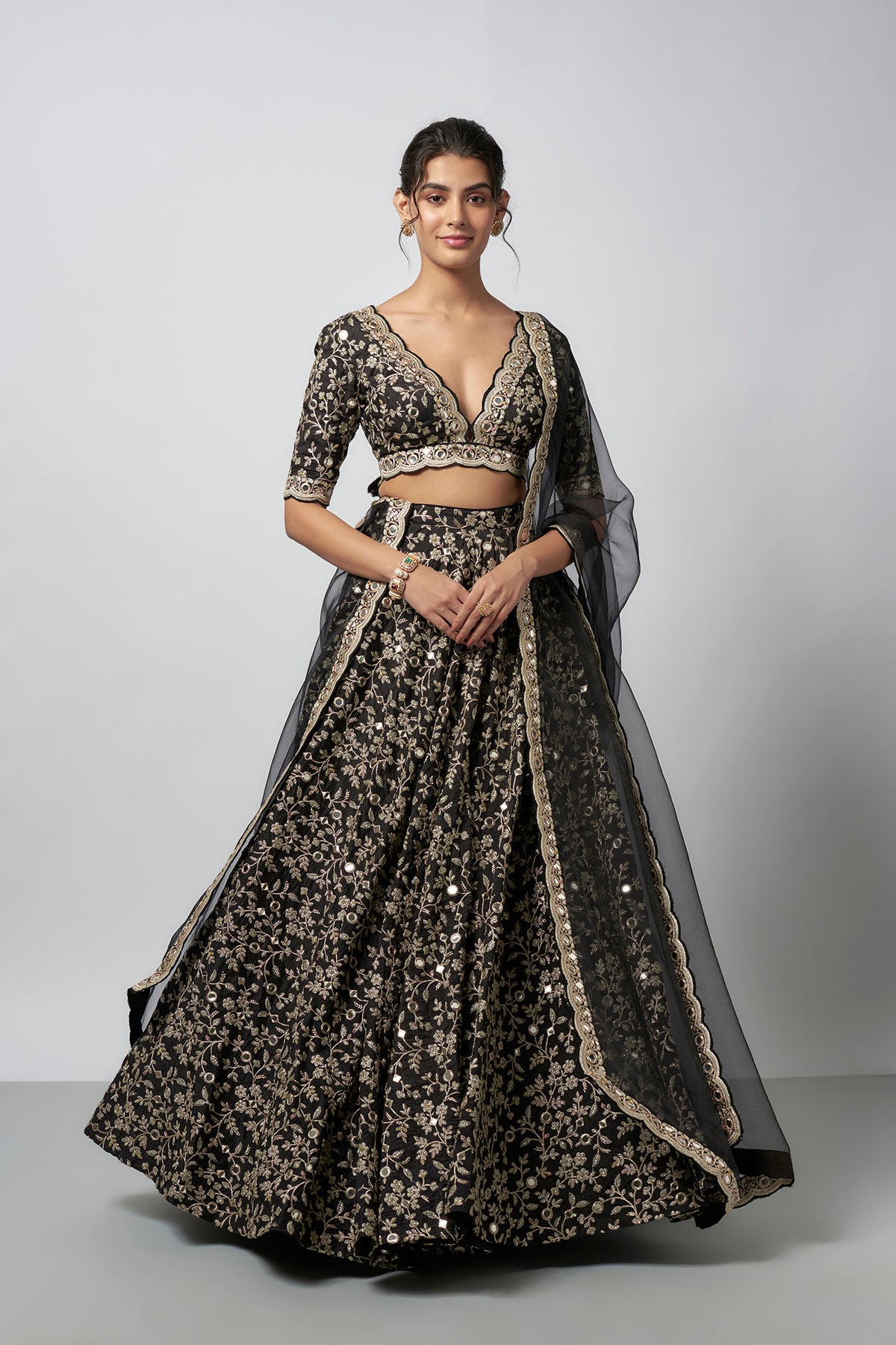 This stunning outfit features a blouse with deep neckline with scalloped edges and floral embroidery. The lehenga is embellished with threadwork creating a detailed floral pattern. An organza dupatta with an embroidered scalloped border completes the ensemble.
