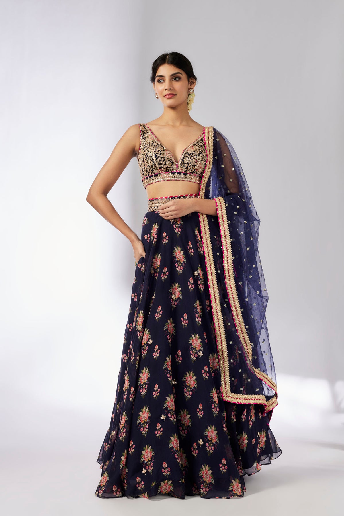 Featuring this gorgeous lehenga set Paired with blouse and dupatta. The embroidery combines gold with pretty threadwork that give this a young, happy vibe.