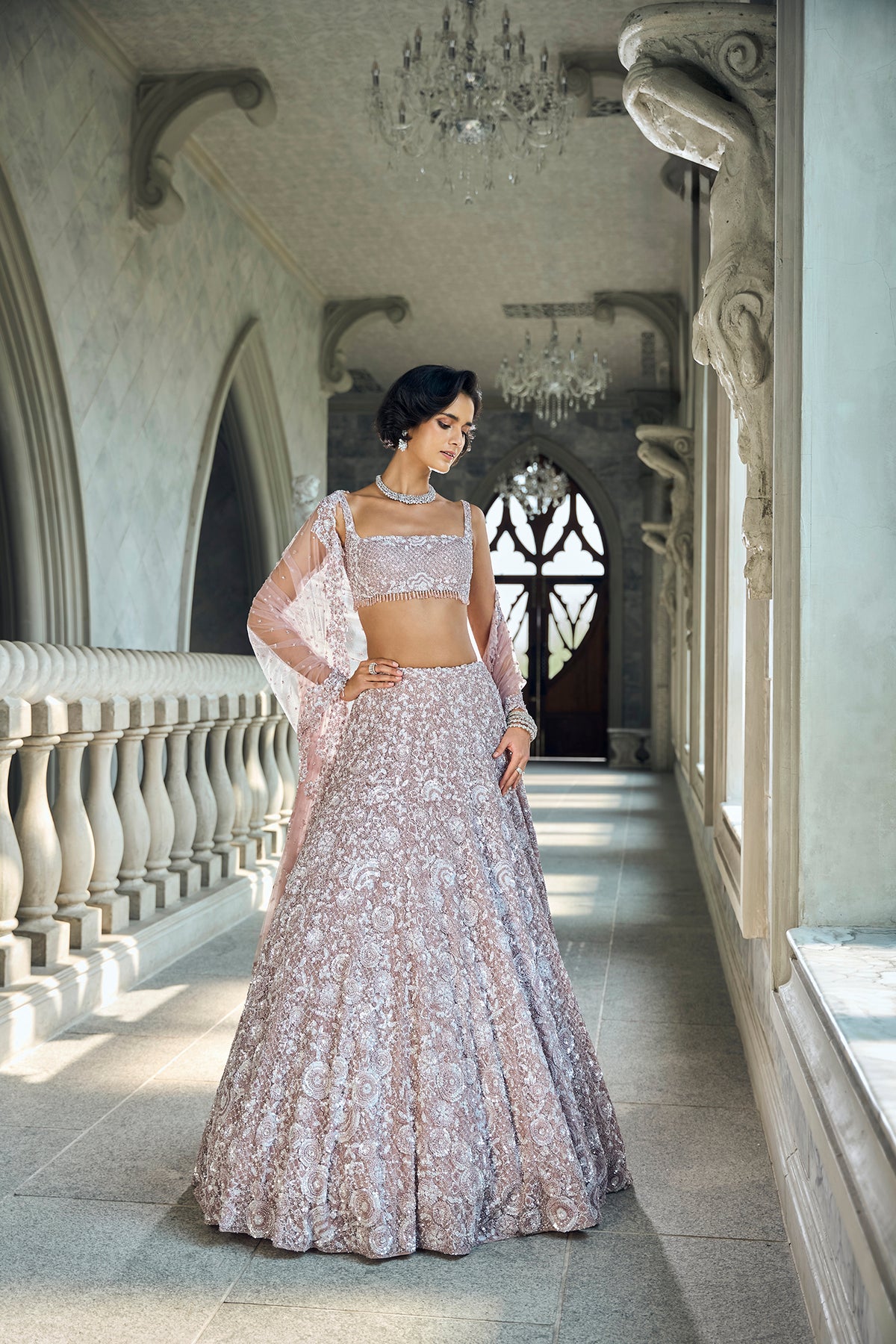 This lehenga set features embroidery in tonal, silver sequin and crystal on a mauve net base. The strappy blouse has delicate crystal tassels at the hem. It is paired with a four sided embroidered net dupatta.