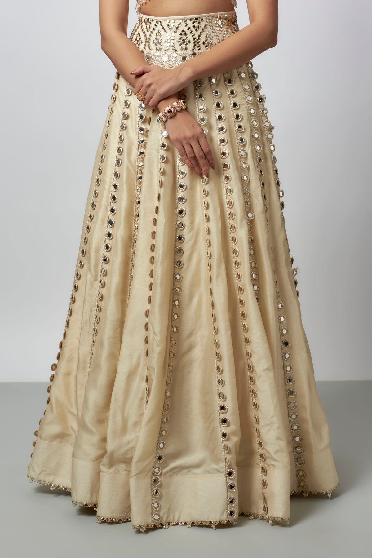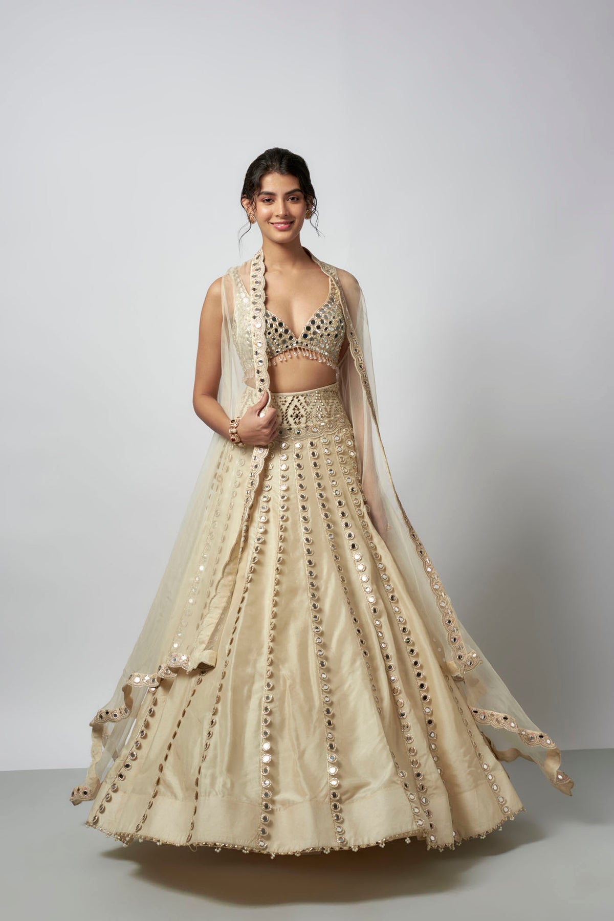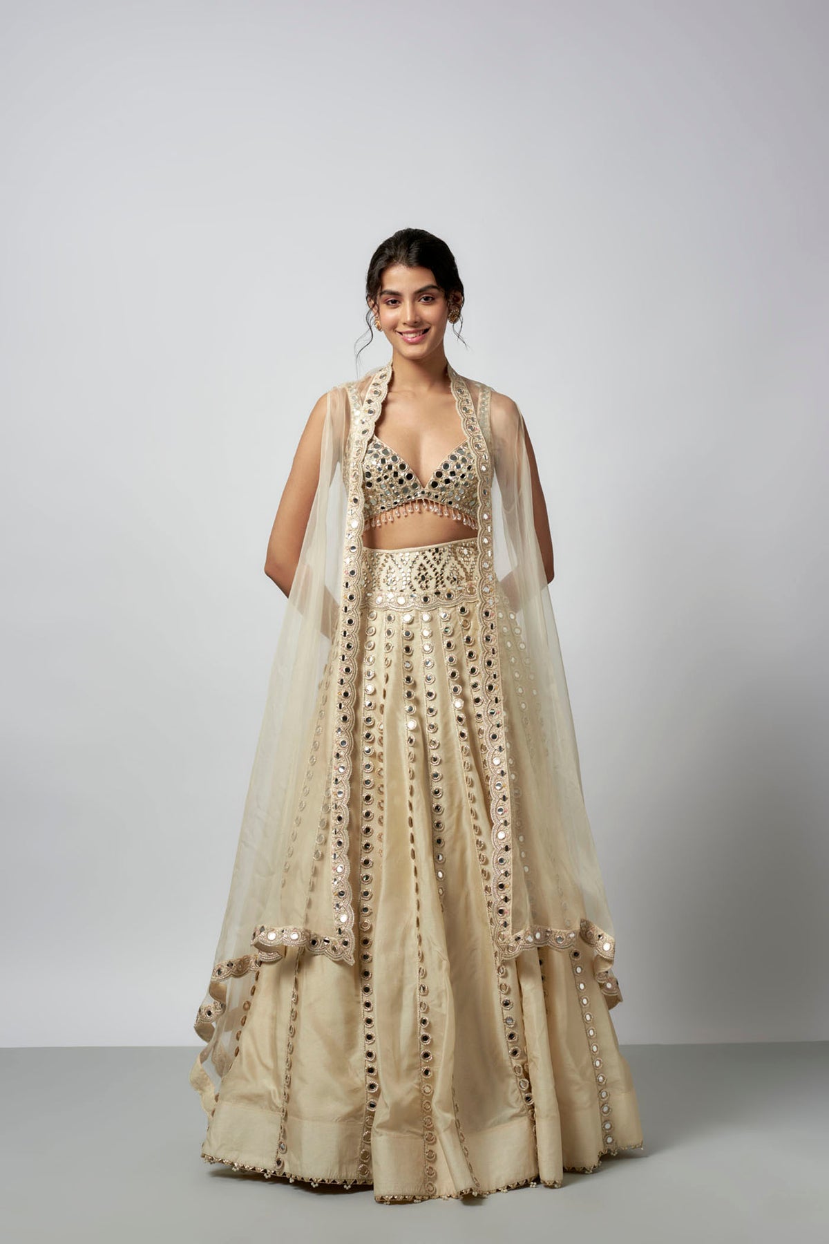 This lehenga features hand emroidered blouse with deep V neckline and shimmering mirror detailing, accentuated by dangling beads along the hem. The lehenga skirt is adorned with symmetrical mirror patterns. A cape with scalloped edges and mirror work completes the look.