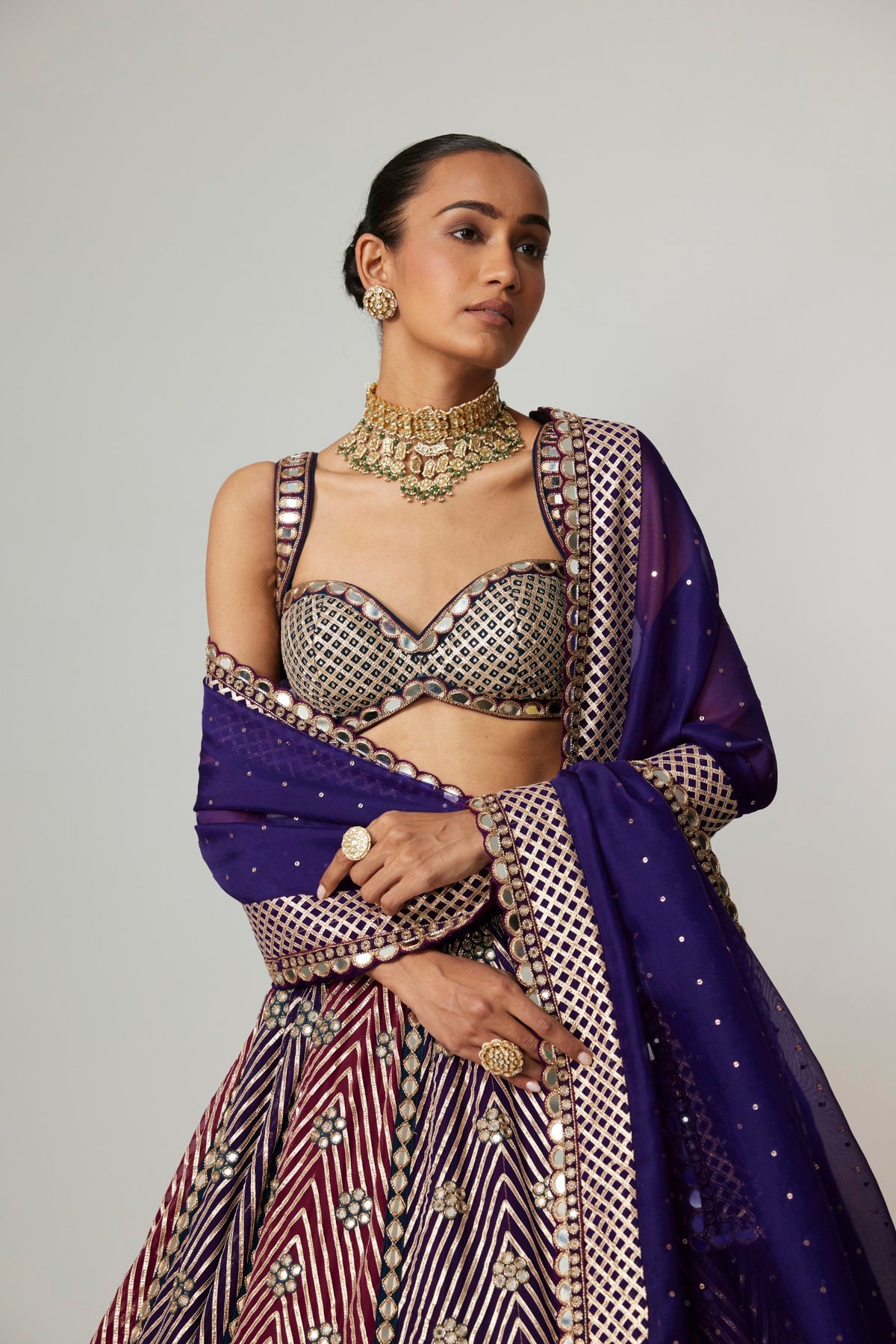 A vibrant multicolor Lehenga in teal,dark purple and wine tones, adorned with golden gota embroidery, paired with a sweetheart neck blouse and purple dupatta.