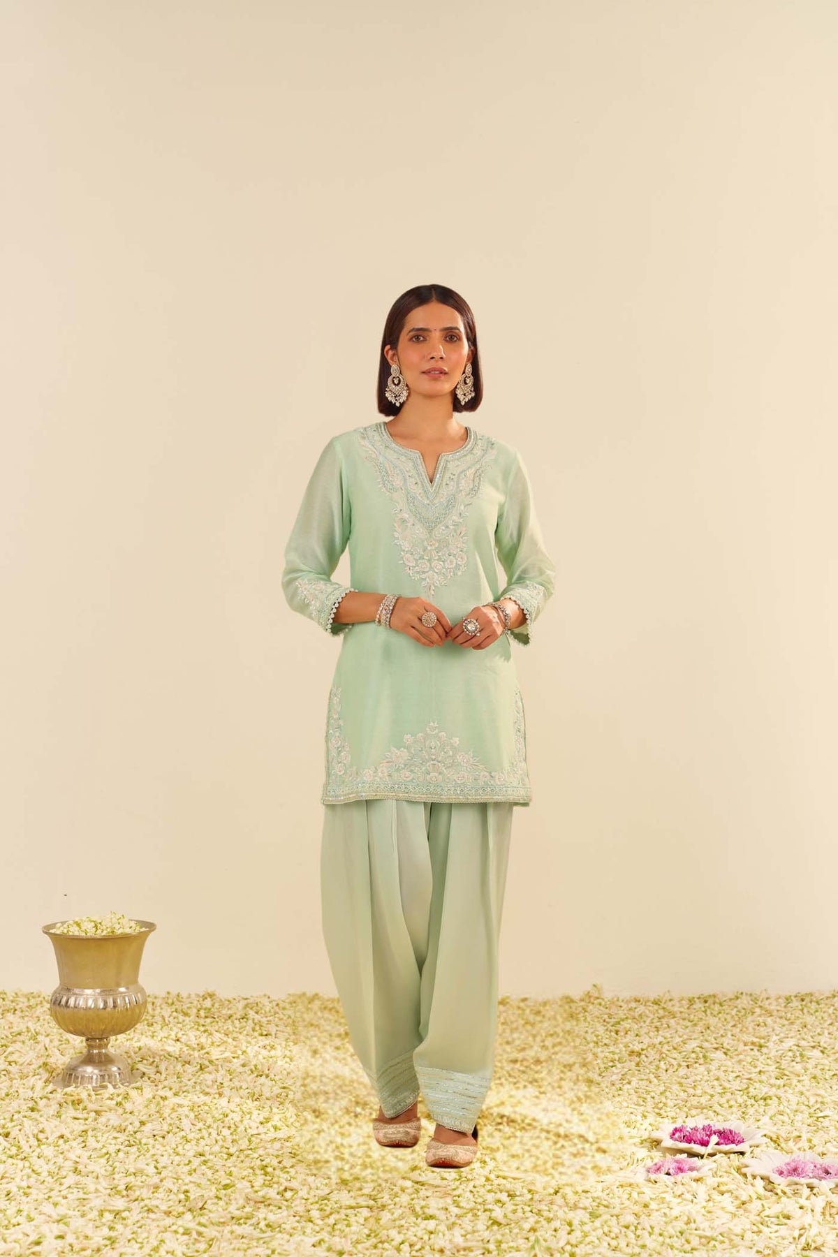 The ensemble is adorned with exquisite Parsi Gara embroidery, intricately highlighted with Tilla, Gota, and pearls, creating a stunning visual appeal. The sleeves of the kurta are elegantly finished with detailed pearls, adding a refined and intricate touch. The entire outfit is beautifully completed with a fine lace and the signature Chanderi silk fabric, offering a polished, luxurious finish that exudes both grace and sophistication.