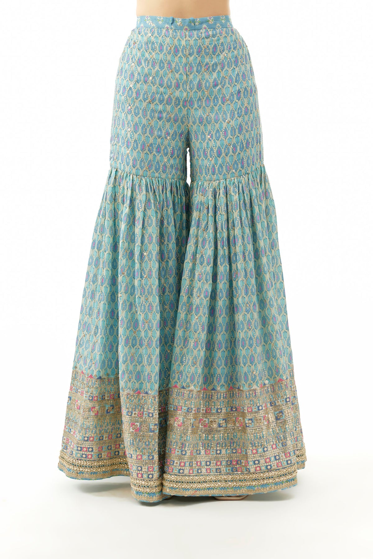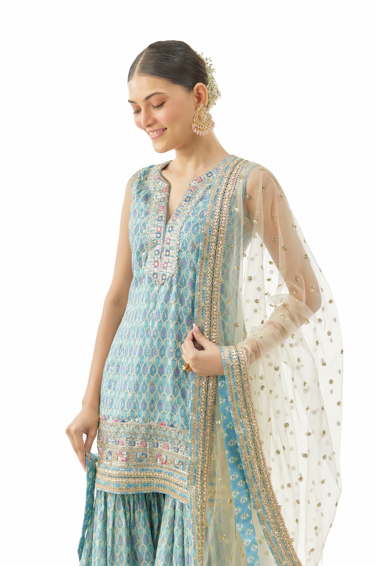 The sleeveless kurta features a straight, elongated silhouette adorned with delicate embroidery along the neckline and hem. Paired with a wide-flared sharara pant in a coordinating print, the set is balanced with an airy dupatta accentuated by scattered work and embroidered borders.