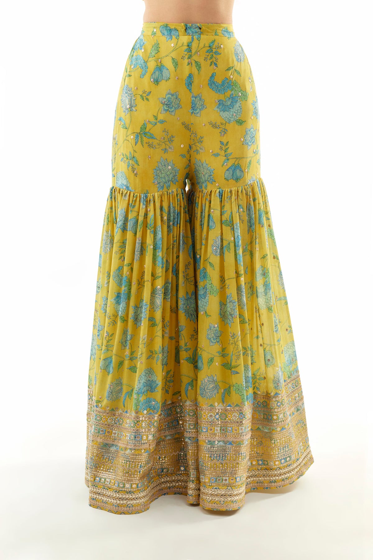 The sharara pants feature a voluminous flare, finished with an ornate embroidered border that mirrors the detailing on the kurti. Completing the look is a sheer net dupatta with scattered sequin butis and a stunning embroidered border.