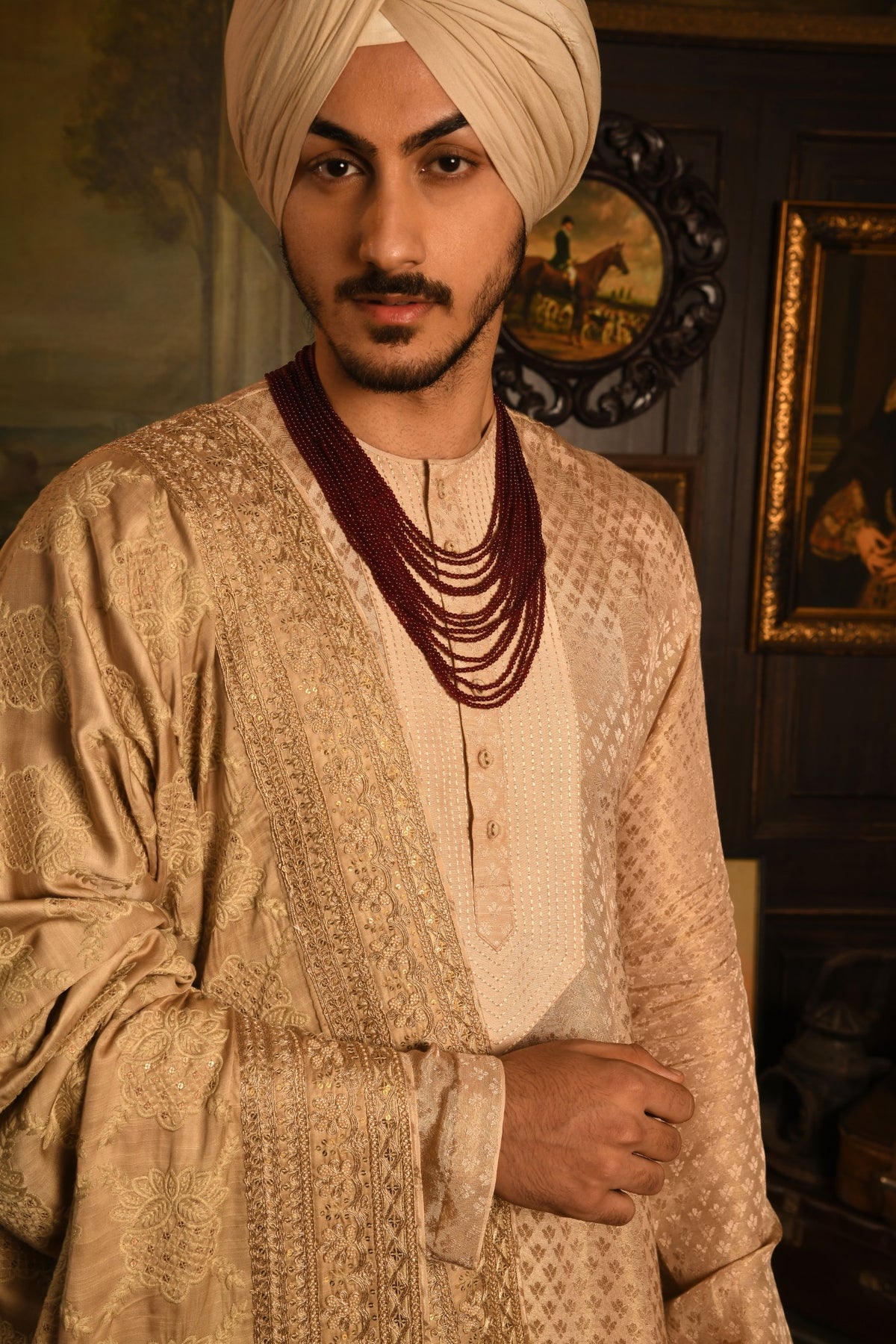 Signature Embroidery and Detail• Signature Dupatta: The sherwani is paired with an exquisite signature dupatta, featuring one of our finest thread embroidery placement patterns. This intricate detailing adds a burst of traditional artistry that contrasts elegantly with the sherwani's linear texture.• Heirloom Embellishments: The entire ensemble is brought to life with meticulous handwork. The sherwani collar is thread embroidered and then highlighted with subtle accents, while the dupatta's opulent design is further enriched with sparkling pearl and Zardozi embroidery, ensuring you possess a commanding and unforgettable presence.