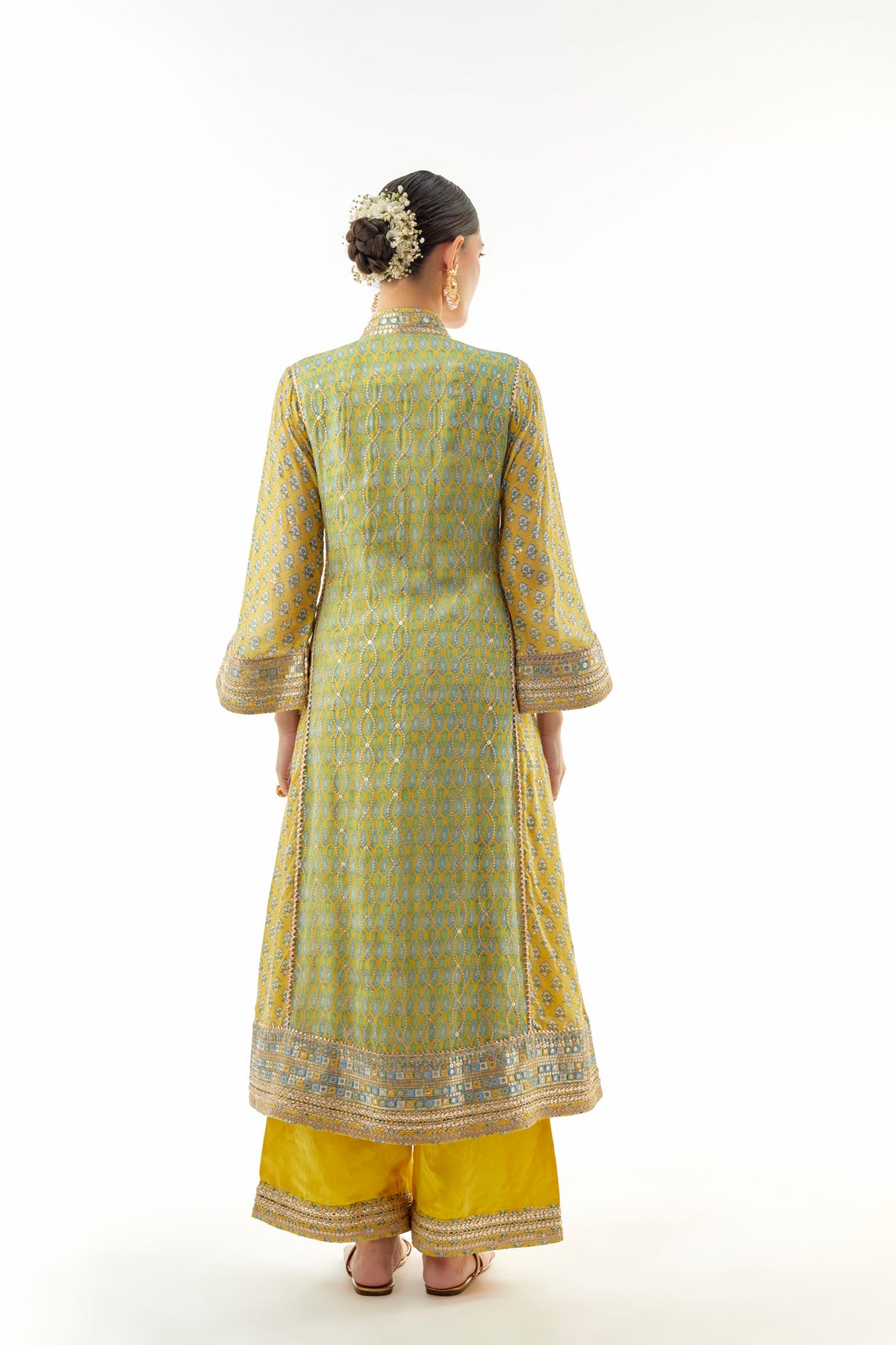 Featuring a knee-length, front-open kurta adorned with intricate zari and sequin embroidery in a delicate floral pattern. Paired with wide-legged palazzo highlighted by a detailed embroidered hemline.