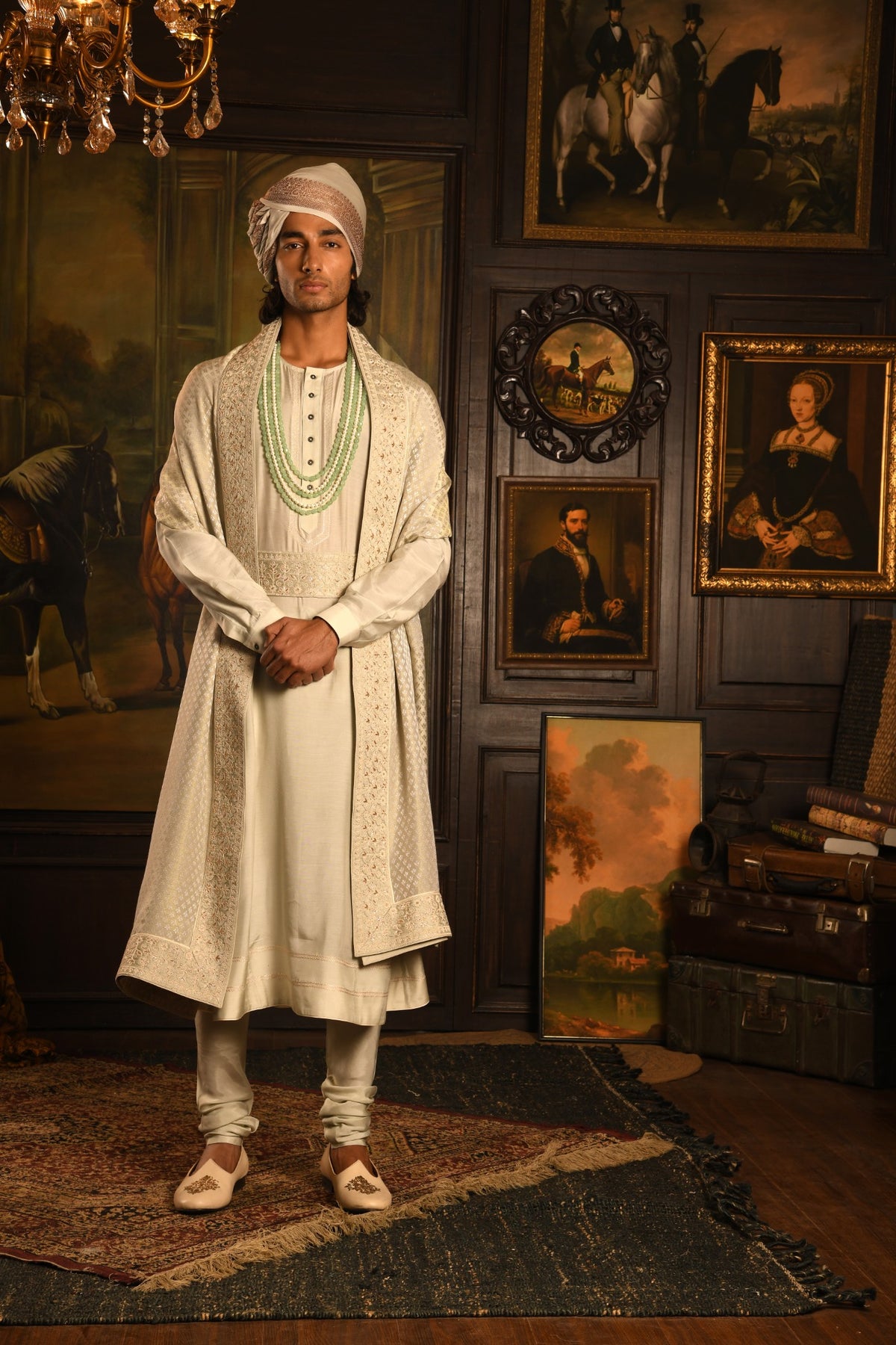 • Anarkali Foundation: The tailored sherwani coat is gracefully layered over a flowing Anarkali Kurta, providing a soft, voluminous drape and a commanding silhouette that is both traditional and architectural.