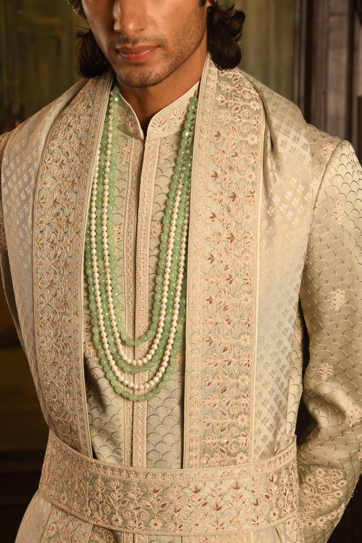 • Mist Green Monotone: The entire ensemble—from the structured sherwani to the flowing kurta and dupatta—is unified in a delicate Mist Green hue. This singular tone creates a refined, continuous canvas that speaks volumes about subtle, high-end luxury.