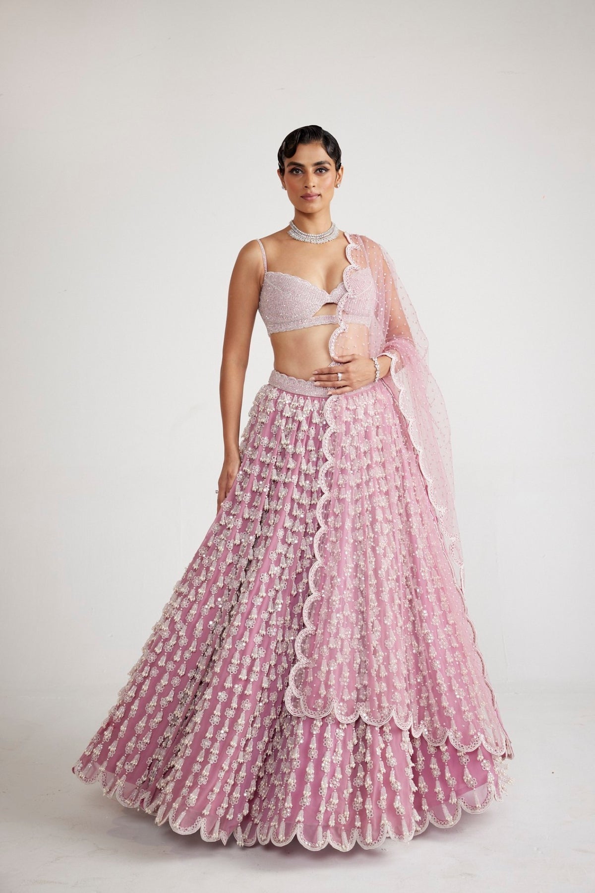 Onion pink chandelier pearl lehenga clubbed with a intricately hand embroidered blouse and dupatta.