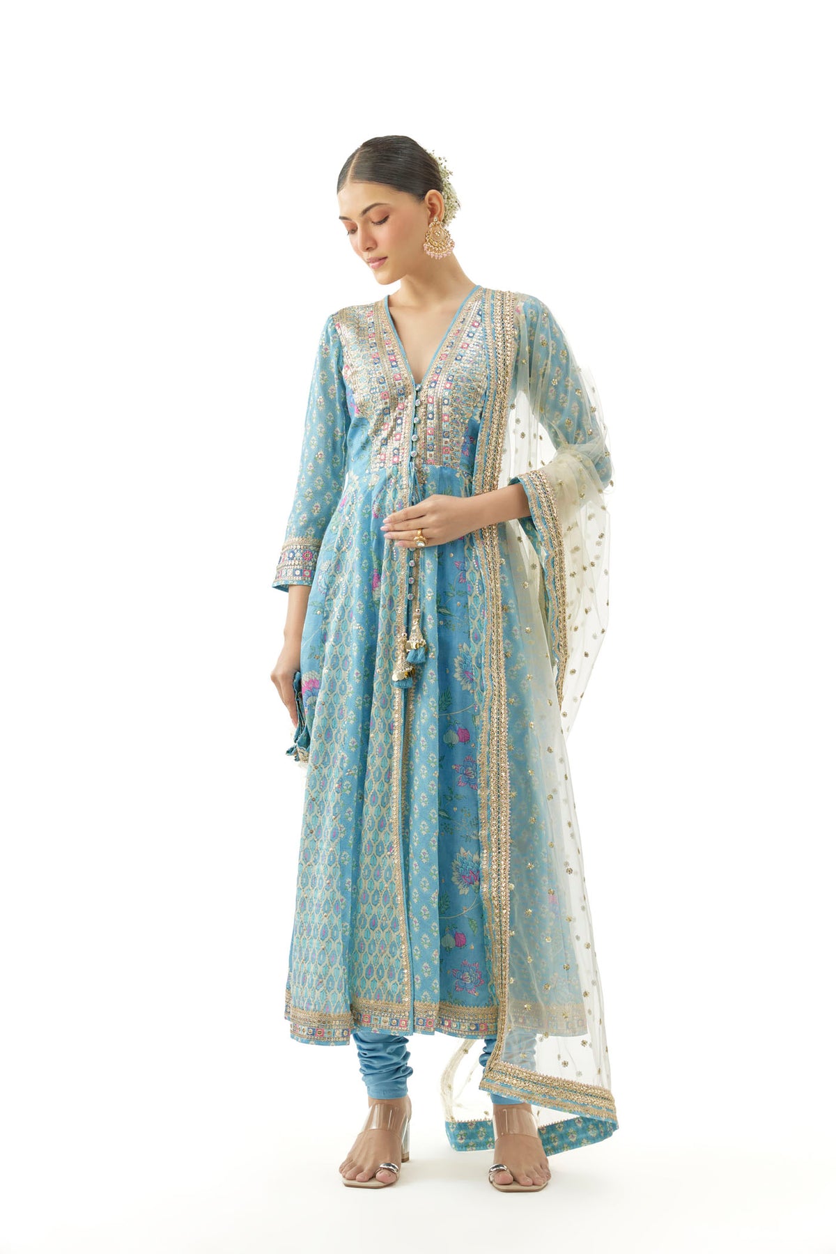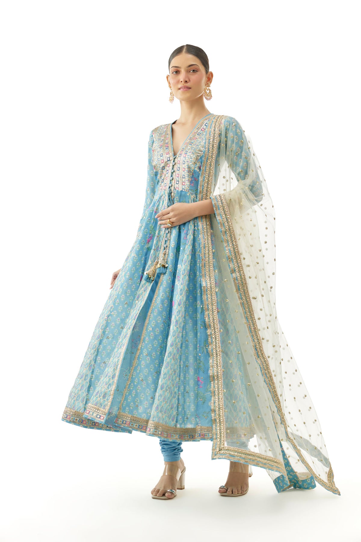 Paired with matching churidar bottoms and a dupatta scattered with sequin embellishments and bordered with fine gota work.