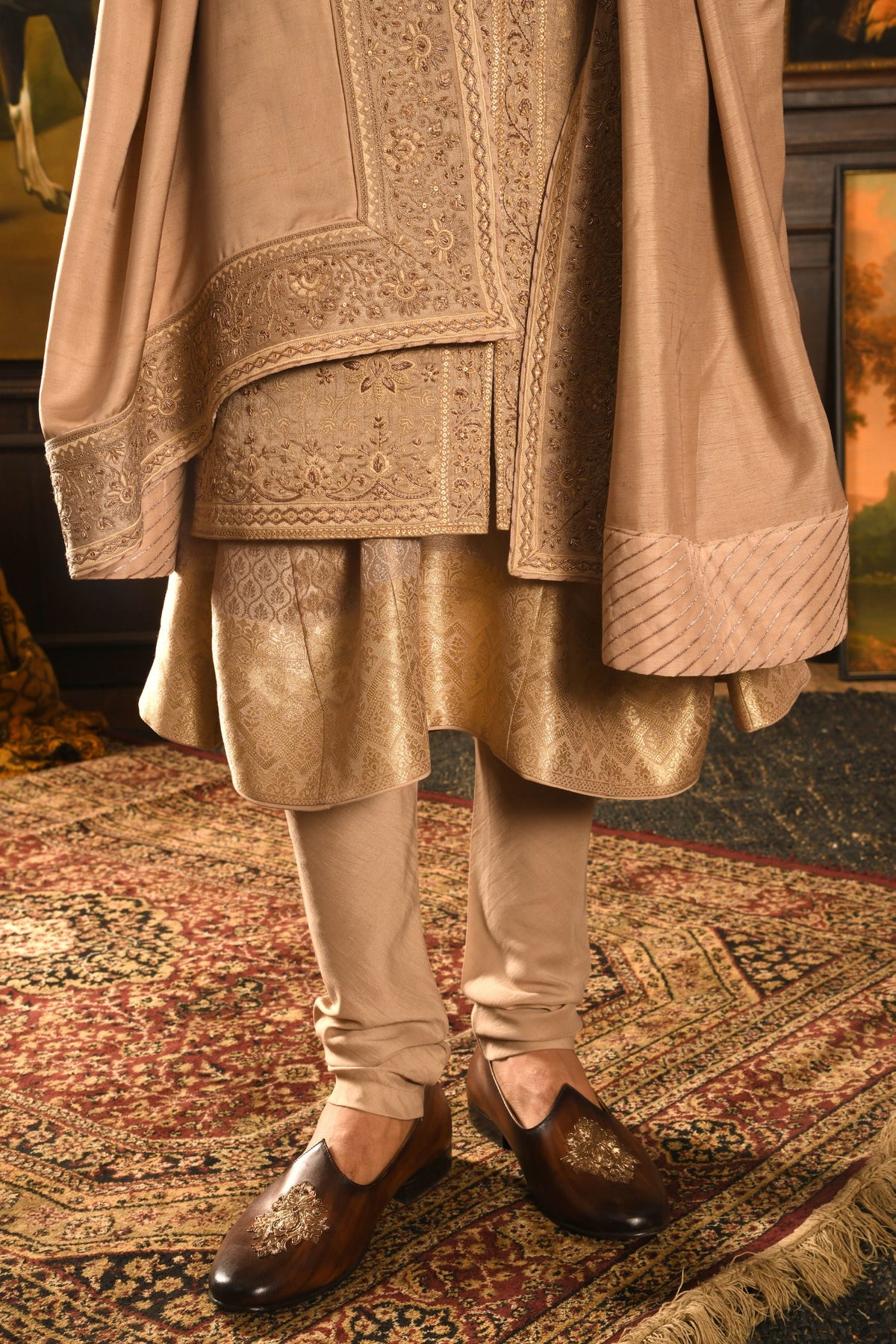• Luxurious Foundation: The structured sherwani is elegantly layered over a flowing Anarkali Kurta, crafted from rich Banarasi silk. This pairing introduces fluid movement and an additional layer of opulent textile, enhancing the regal silhouette.
