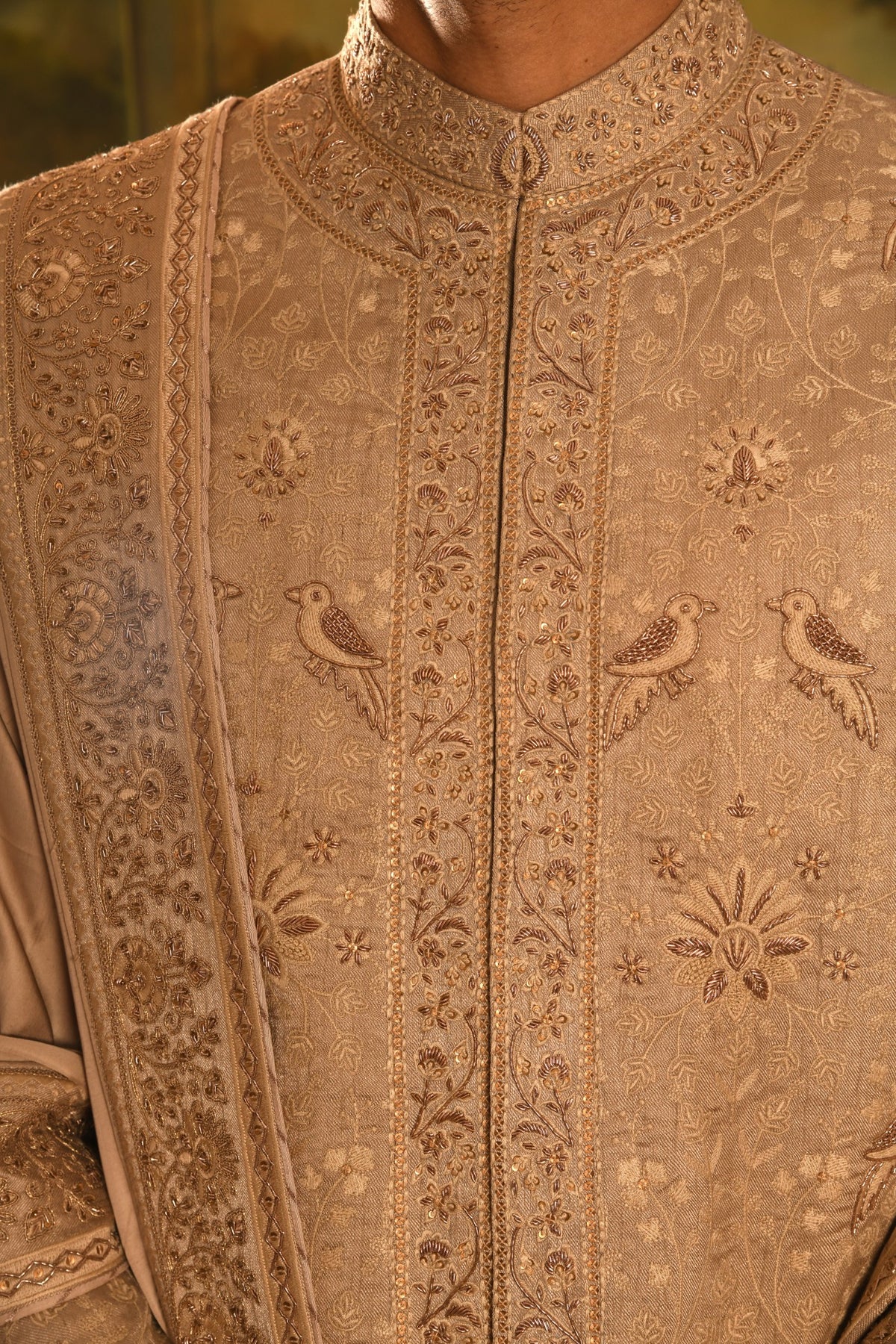 • Harmonized Embellishment: The accompanying dupatta features its own finely thread-embroidered pattern, meticulously chosen to complement the sherwani's intricate design.