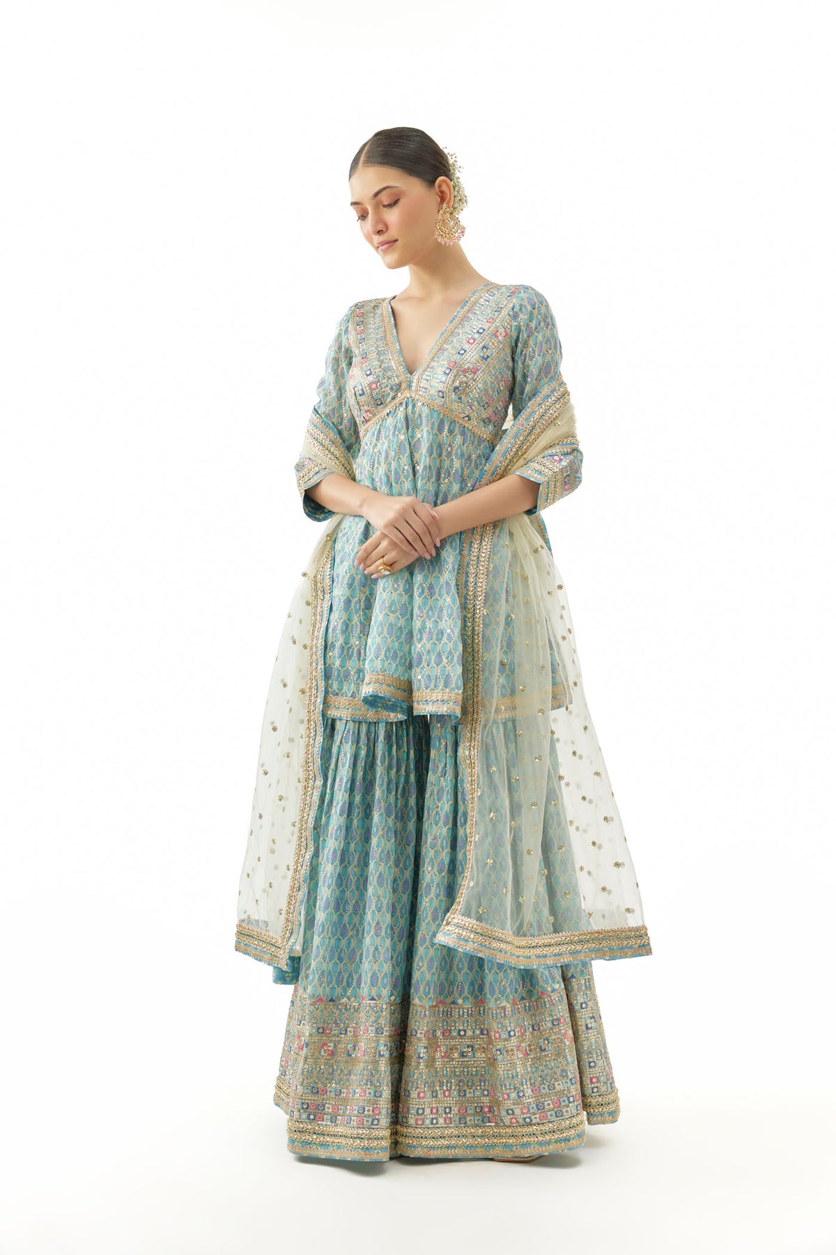 Paired with a soft net dupatta, scattered with tiny sequins and a shimmering gota border.