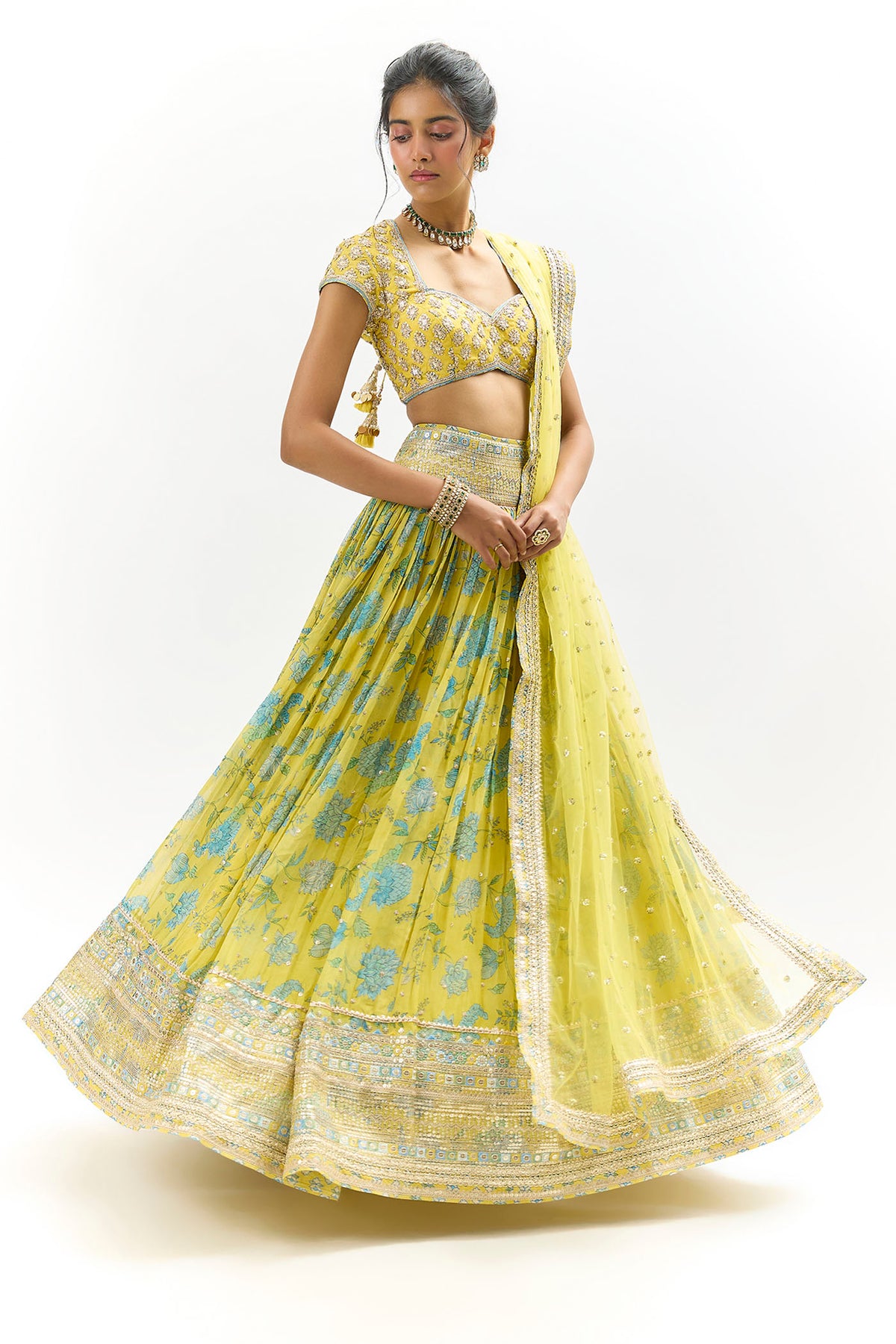 The flared lehenga skirt is a visual delight, adorned with floral motifs and extensive work at the hem creating a dazzling appeal. Completed with a matching dupatta, subtly dotted with sequins and a border to complement the embroidery.