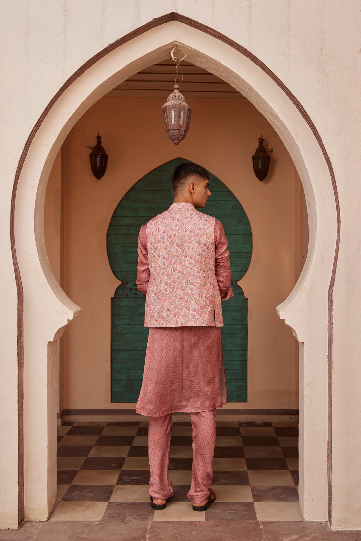 This men’s three piece kurta set has kurta and churidar of pink print with buttons and there is beige print bandi on which tagai is done. The buttons of bandi also have tagai