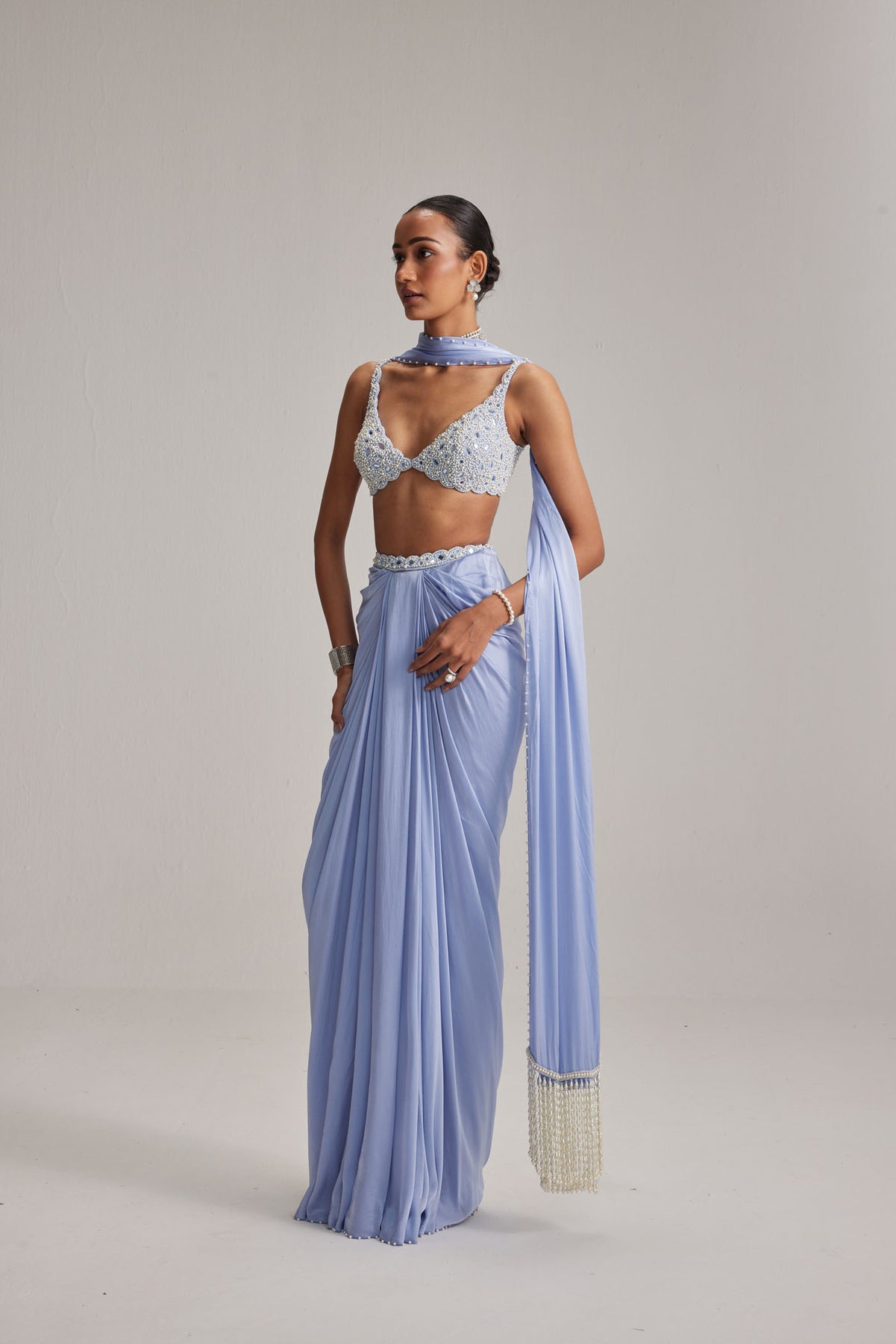 Dew blue Satin draped skirt set paired with a heavily mirror and pearl embroidered blouse and a satin stole.
