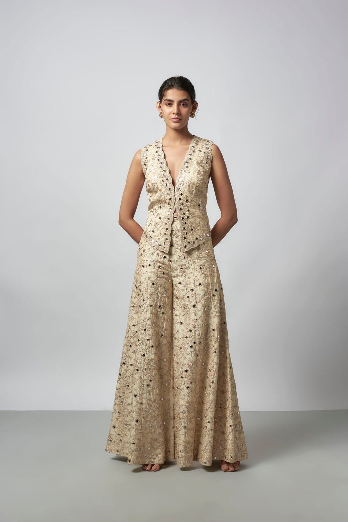 This mirror-embellished vest features a deep V-neckline and scalloped edges.Paired with flowing, wide-leg trousers with delicate embroidery and mirror accents, creating a cohesive and refined ensemble.