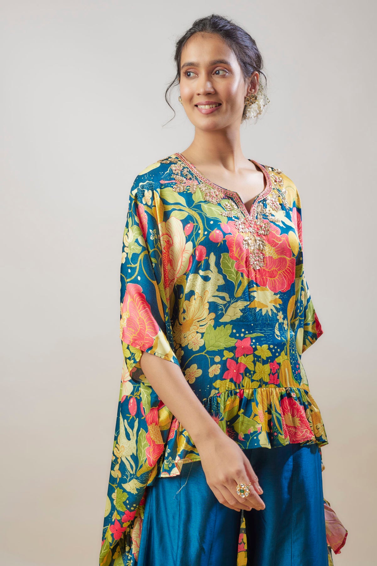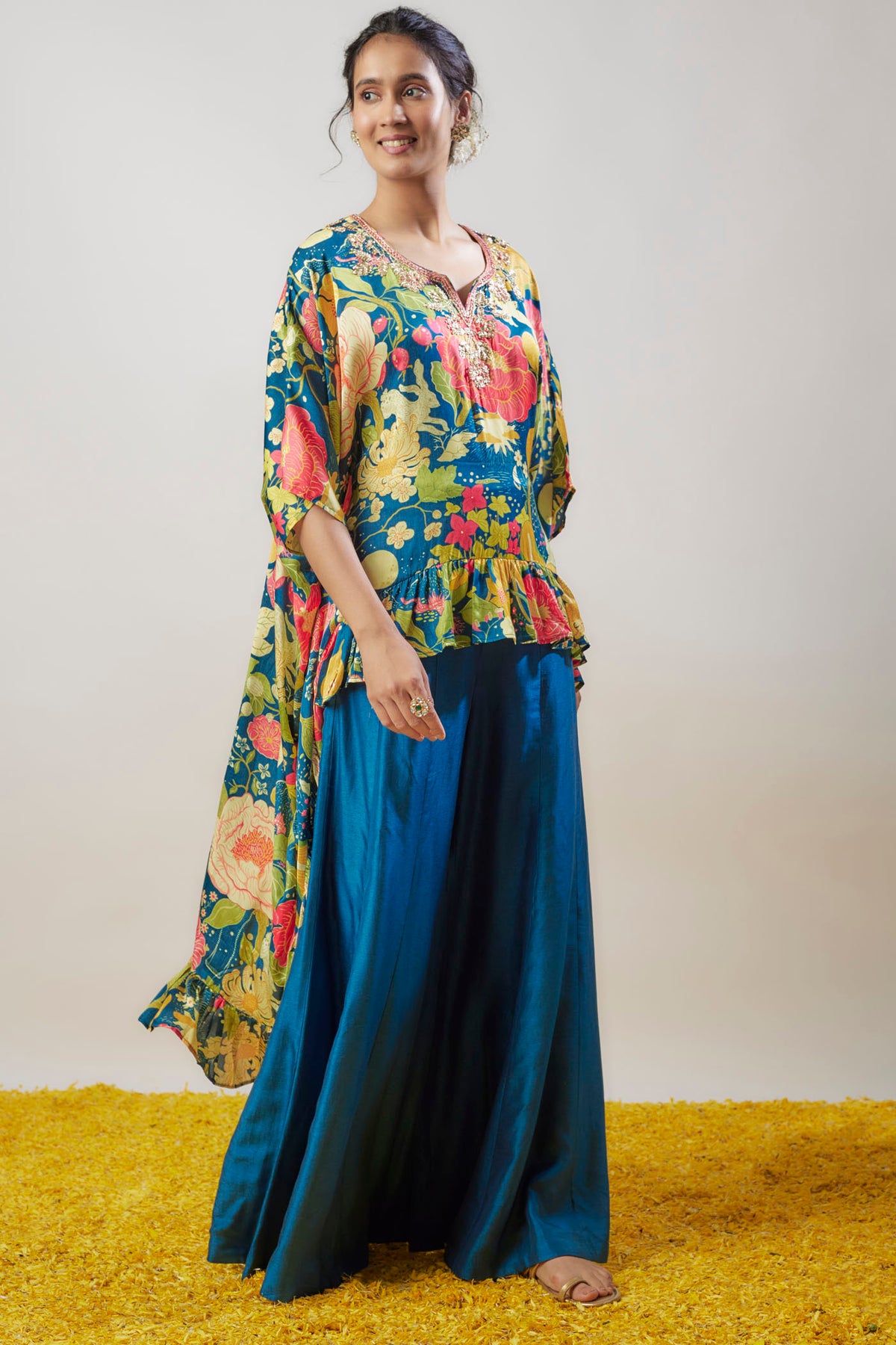This floral flowy top paired with flared pants creates a breezy, effortless look, perfect for both casual outings and daytime events. The combination offers comfort with a touch of chic elegance.