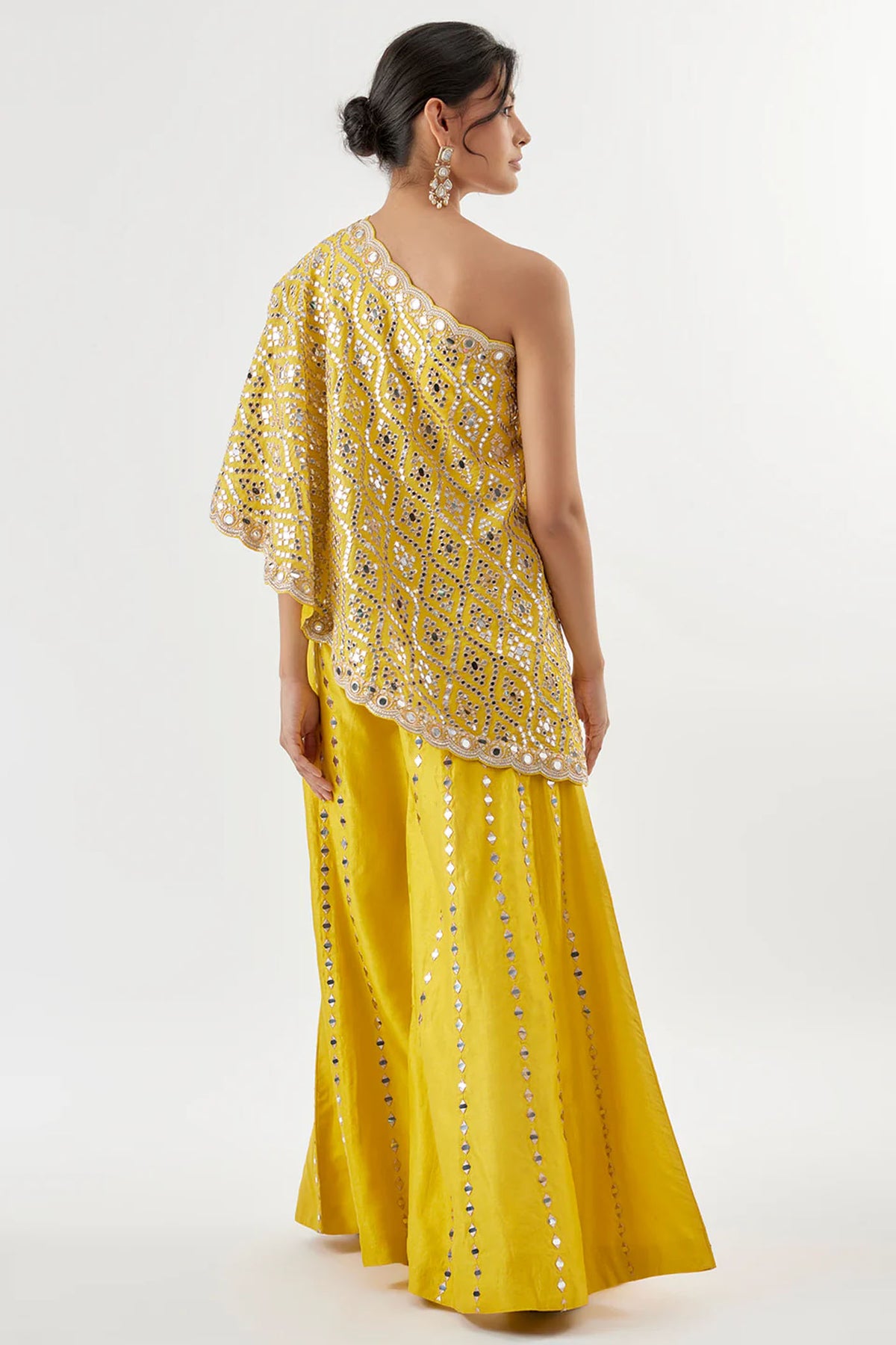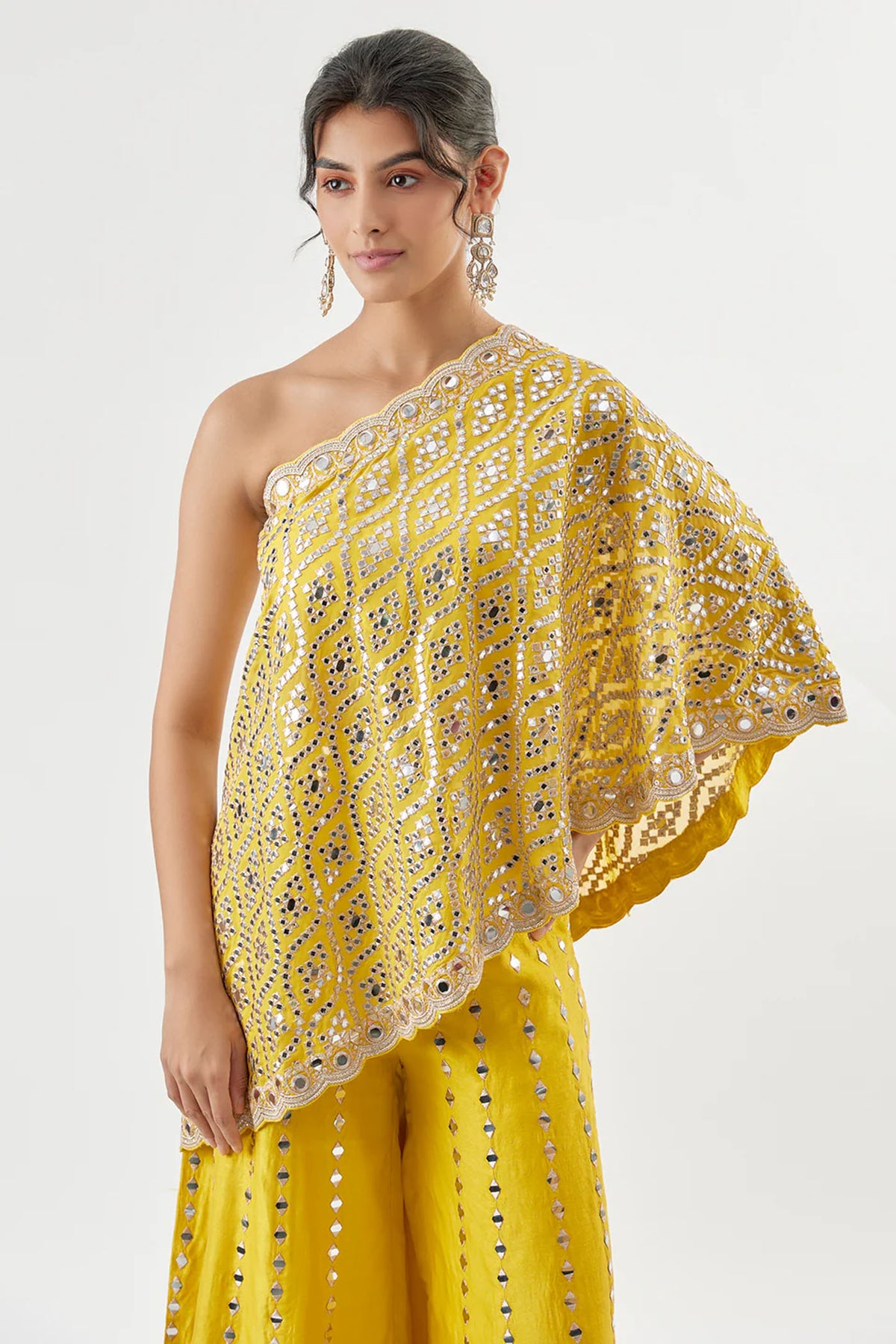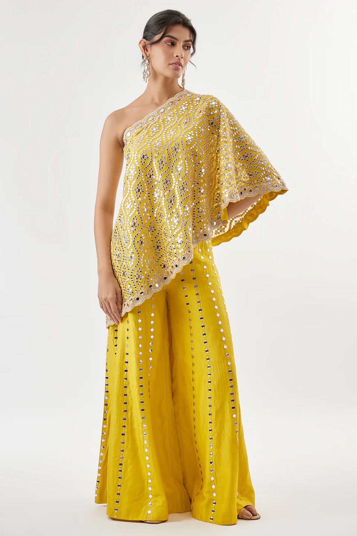 This contemporary pant set features a one-shoulder top with exquisite katri mirror work and intricate embroidery. The flared trousers are adorned with vertical mirror detailing making the ensemble perfect for modern occassions as well.