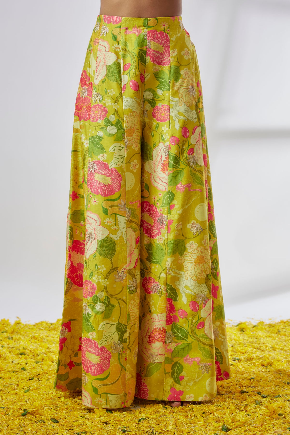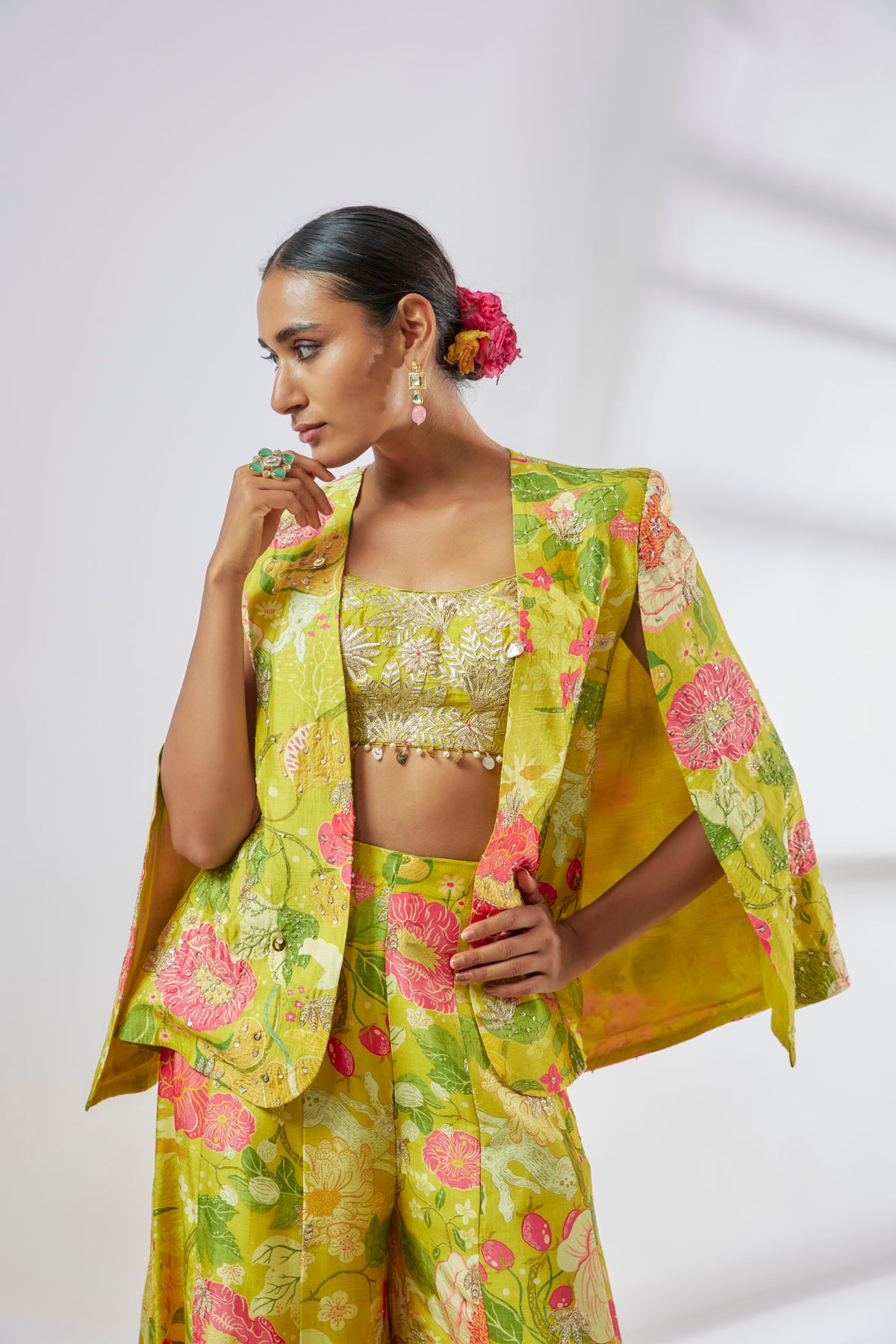 This vibrant outfit features a lively yellow and pink floral print, comprising a chic cape blazer, an intricately embroidered crop top adorned with delicate tassels, and a panel pant. Perfect for festive occasions, it blends traditional elements with contemporary flair.