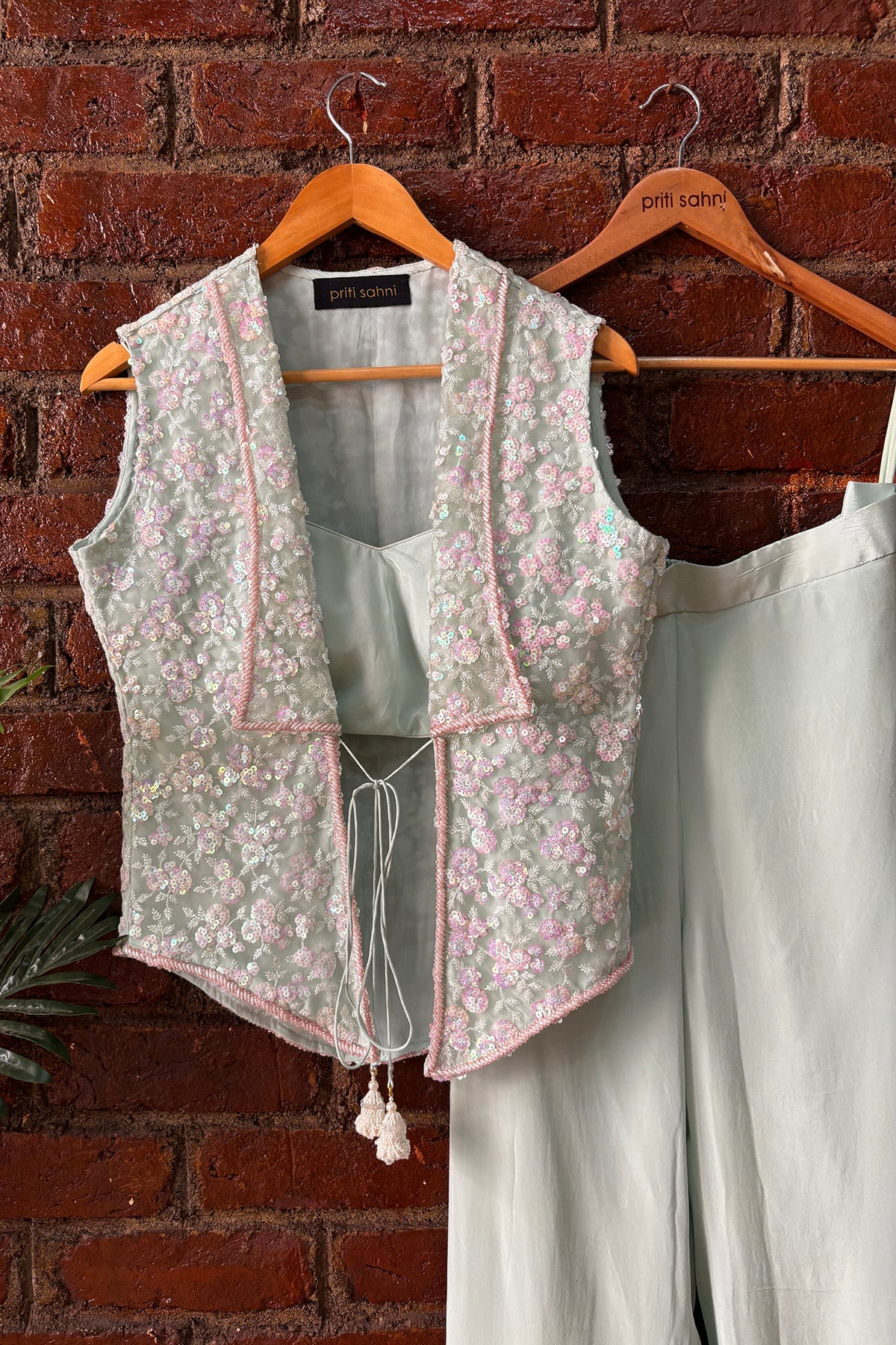 Mint Green crepe palazzo pant and bustier set paired with Sequin and Beads work jacket with tie up detailing