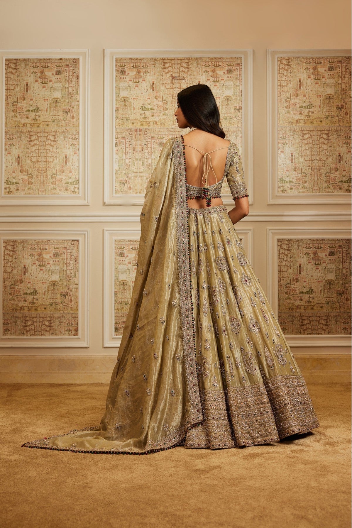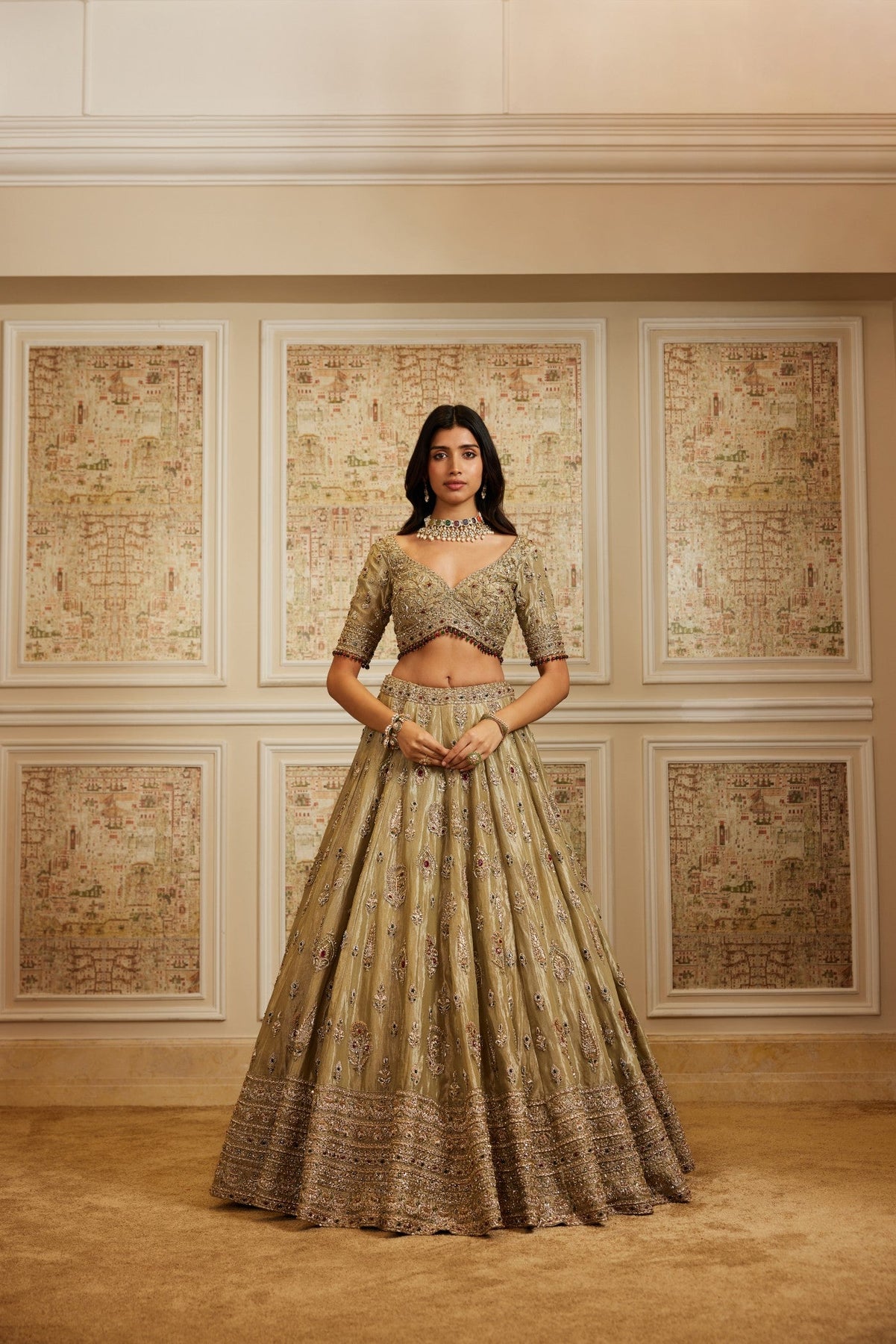 Radiate sophistication in this antique gold lehenga, crafted with delicate hand embroidery in zardozi, sequins, resham, and cutdana work. The surreal ensemble is based on pure tissue. The lehenga is adorned with floral and paisley-inspired motifs, intricately scattered across the fabric, with a richly embellished border that adds grandeur. The blouse, featuring a contemporary wrap-style neckline, is heavily embroidered, blending tradition with modern finesse. Complemented by a sheer embellished net dupatta that adds fluidity and timeless elegance to the look