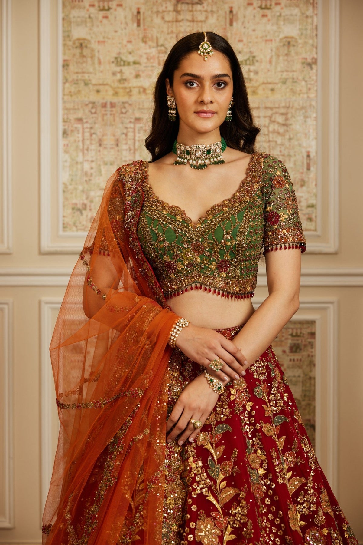 Radiate festive grandeur in this striking red lehenga with rich green and gold embellishments. Rawdah lehenga set is based on net, The skirt is intricately embroidered with paisley and floral motifs, brought alive with resham, sequins, zari, and stonework for a luminous effect. The blouse, designed with a sweetheart neckline and detailed embroidery, pairs beautifully with the bold ensemble. Adding contrast is a sheer burnt orange dupatta with ornate borders, giving the outfit a vibrant, royal finish. Ever After is more than bridal couture; it is a journey into love’s most cherished chapter — where every bride steps into her own fairy tale, radiant with grace, confidence, and promise.