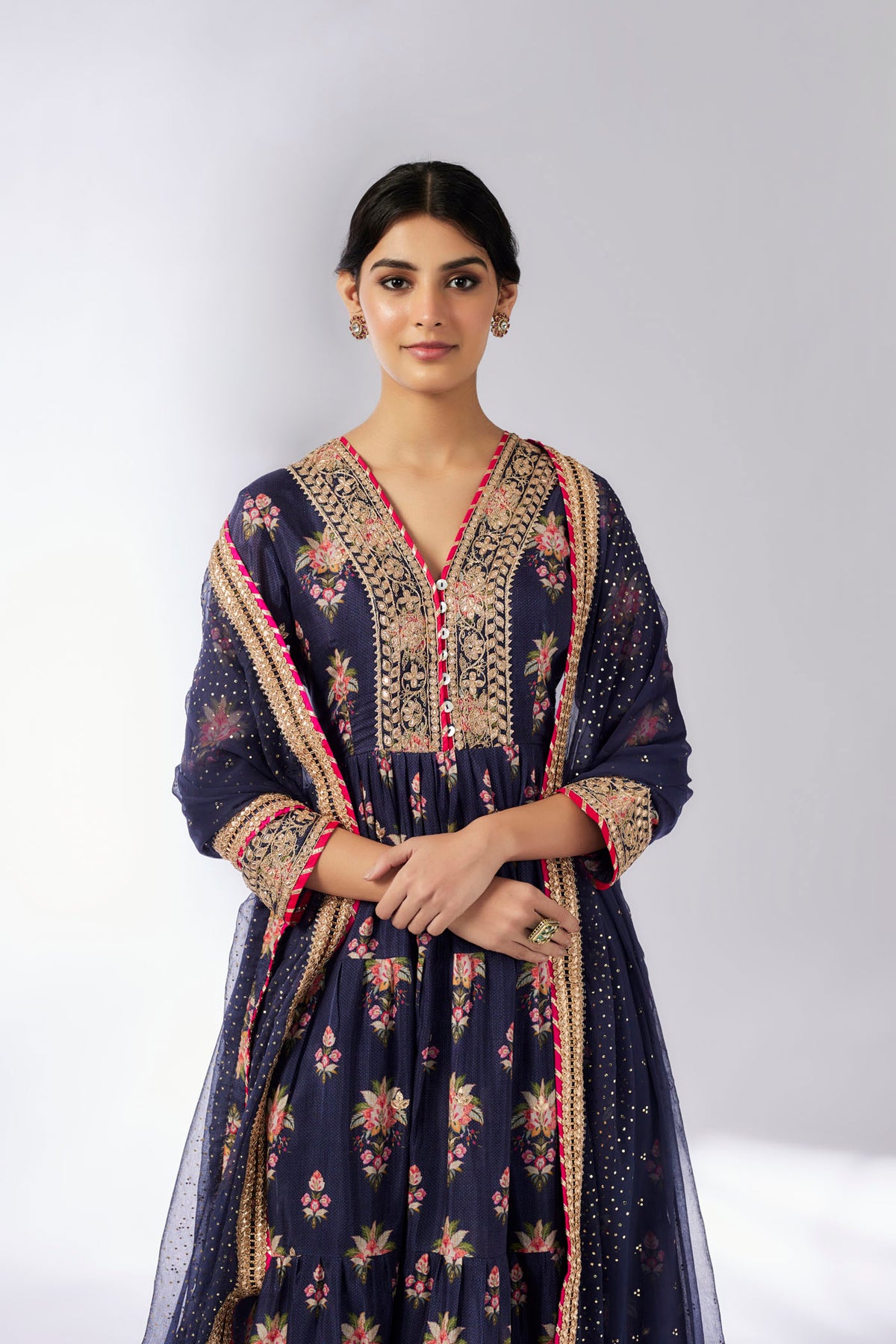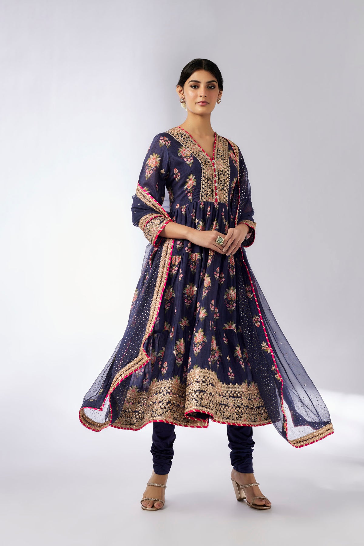 This look is perfect for a touch of glamour and sophistication. Embrace the beauty and charm of the sanganer, and let its intricate details and colorful embellishments transform your ensemble into works of art.