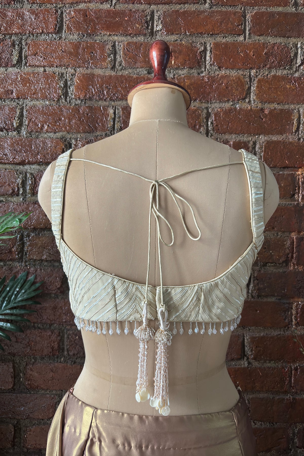 Bronze shimmer georgette pre-stitched saree with Mirror work detailing paired with Gota work blouse in tassel detaling
