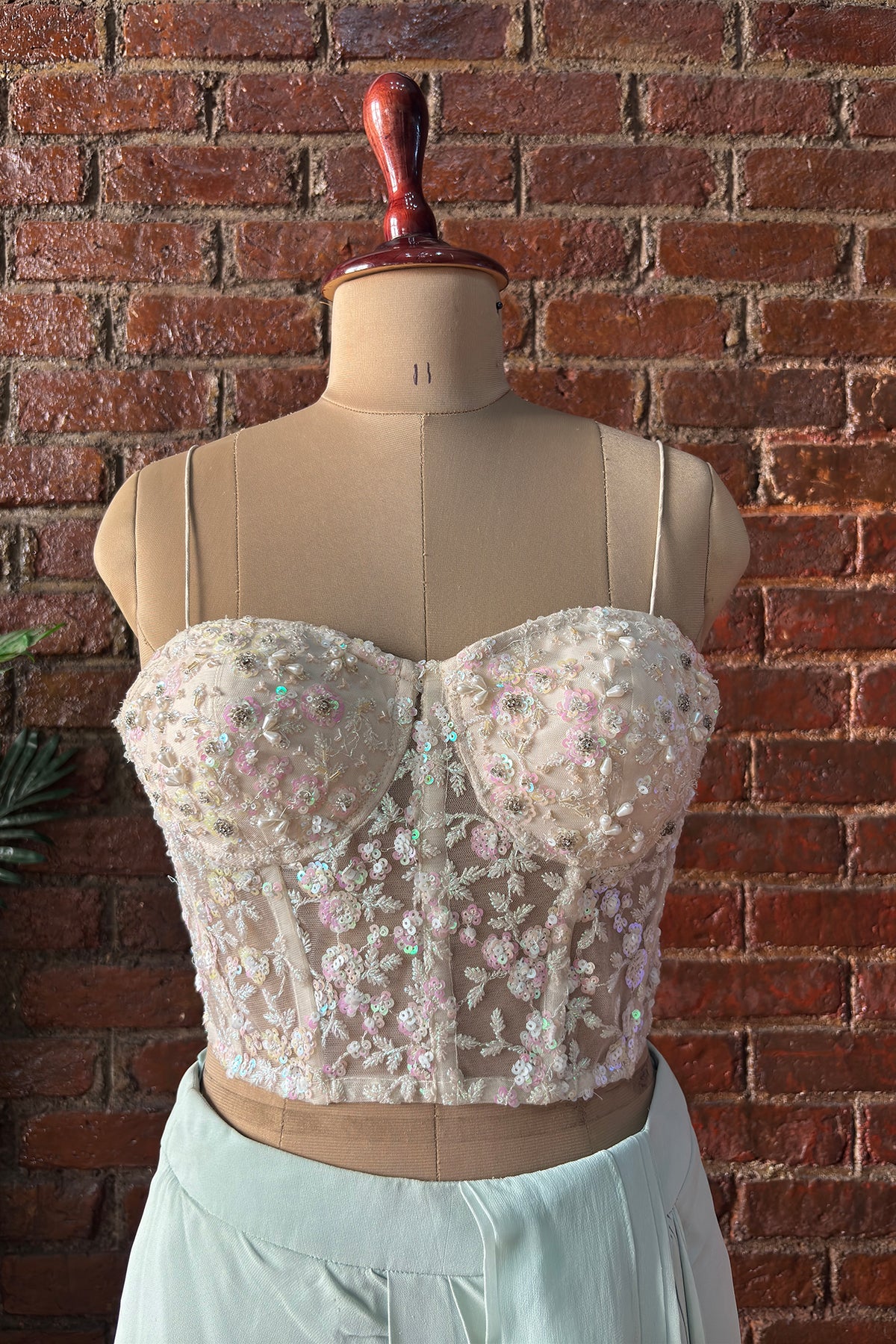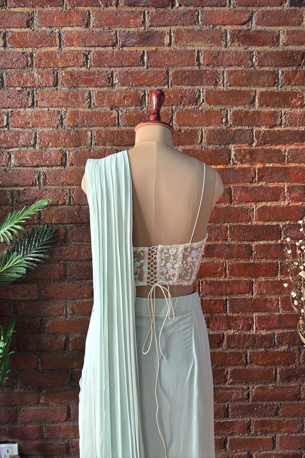 Ivory Sequin, Pearl and Beads work corset paired with Mint Green georgette pre-draped saree