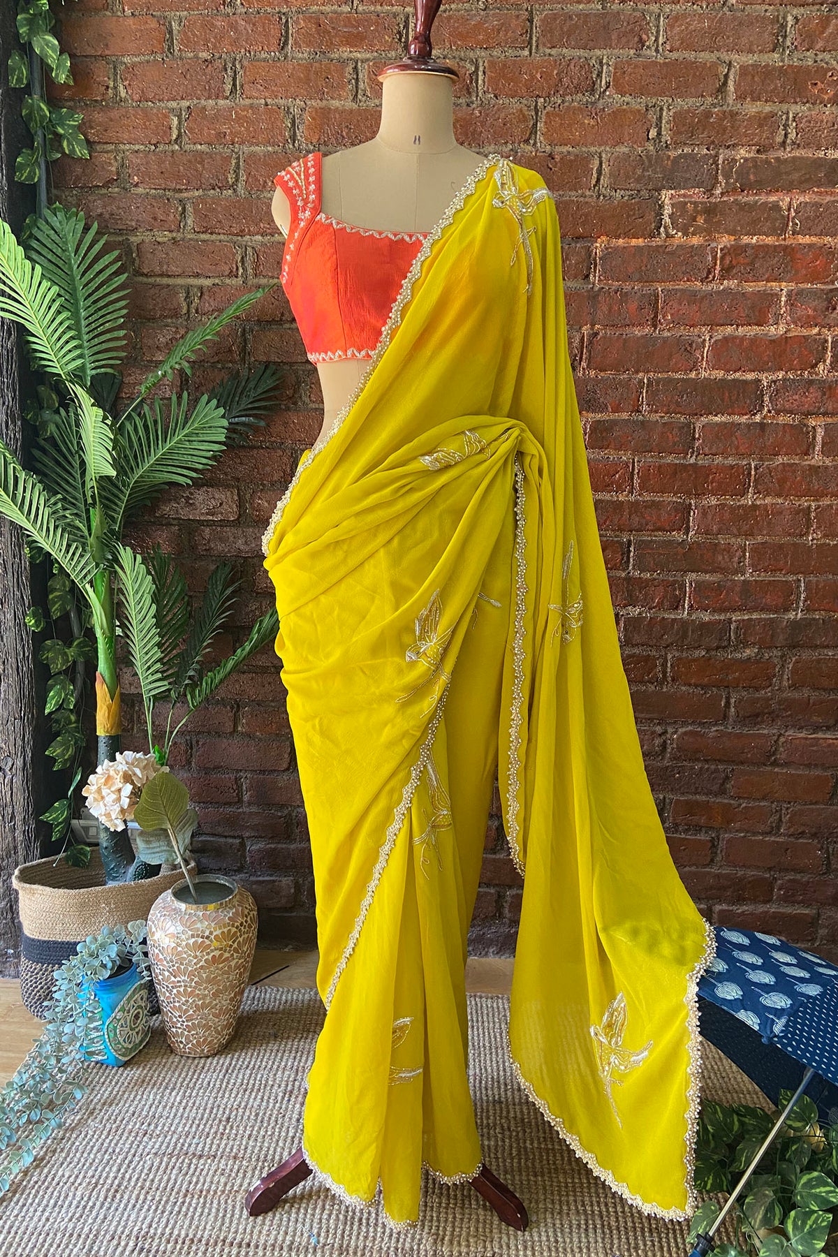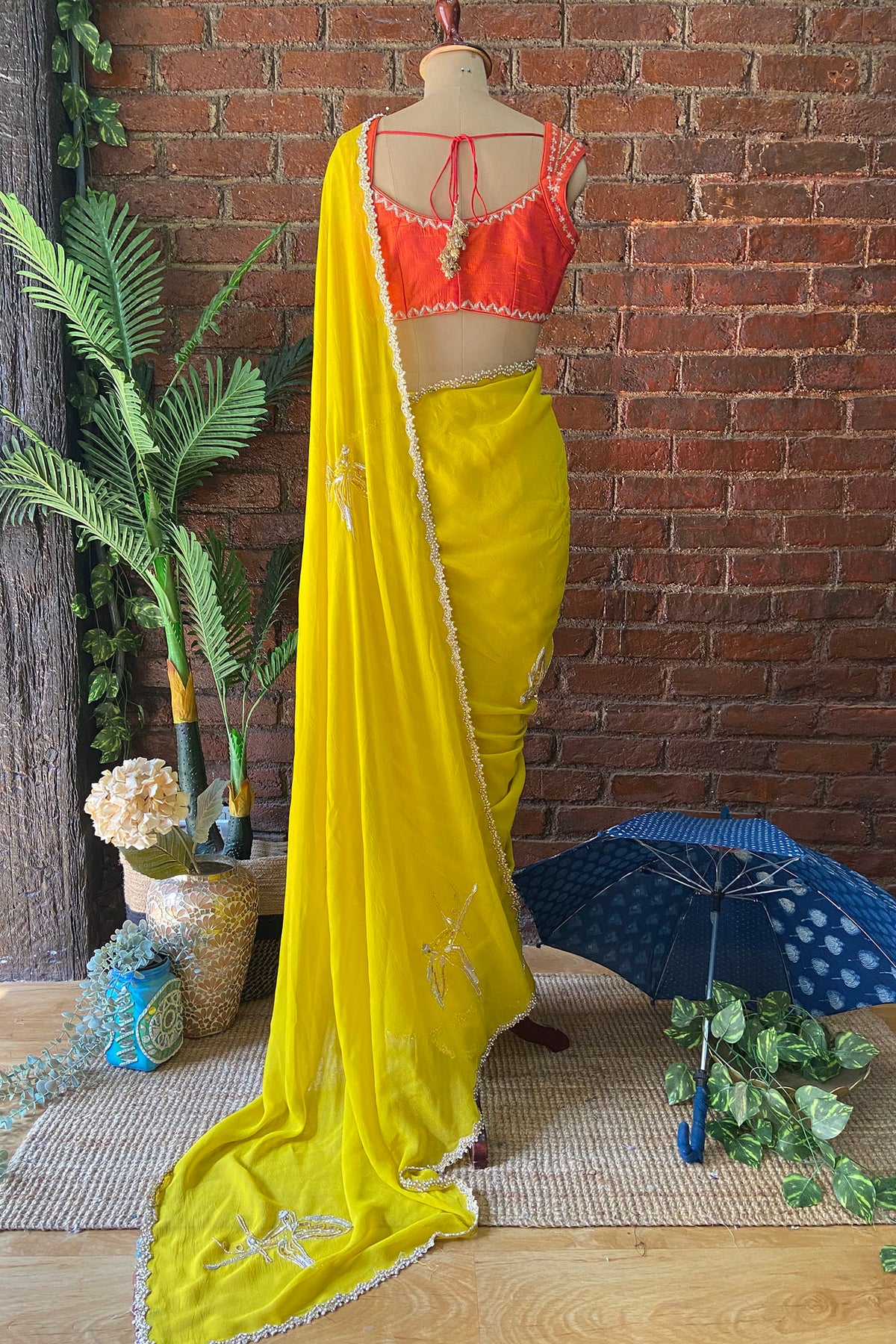 Mustard georgette saree with floral Contour hand embroidery, paired with Orange raw silk embroidered blouse