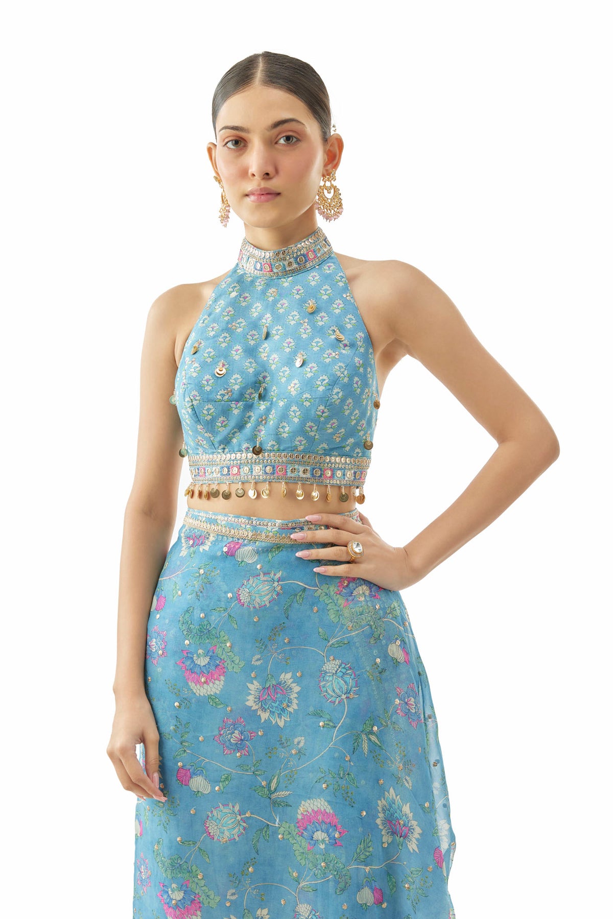 The saree features a pre-pleated silhouette with a voluminous flair and a stunning mirror and sequin embroidered border that adds a festive sparkle. Paired with a high-neck halter blouse intricately embellished with mirror work and delicate detailing, the look is sophisticated, modern, and ready to wear.
