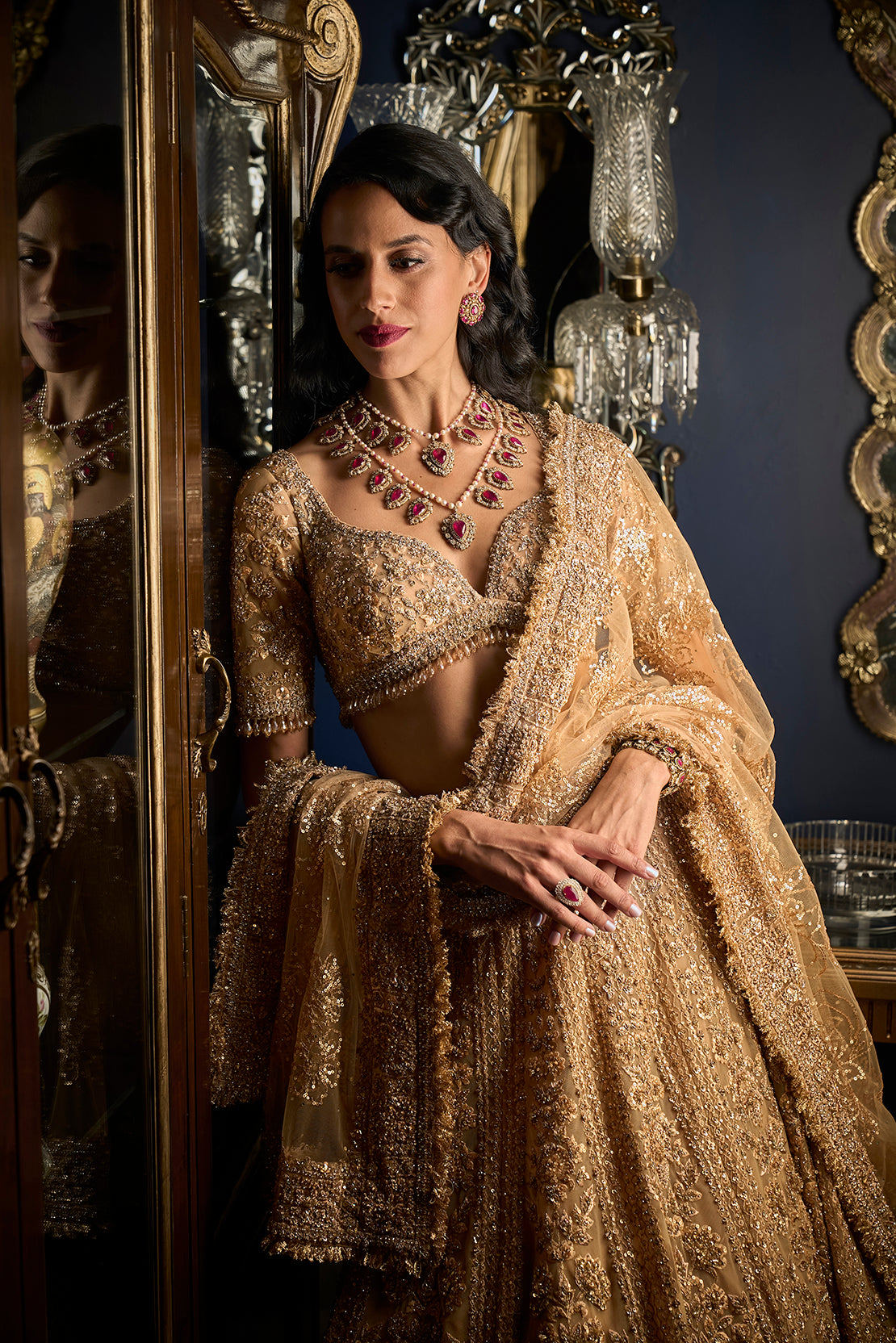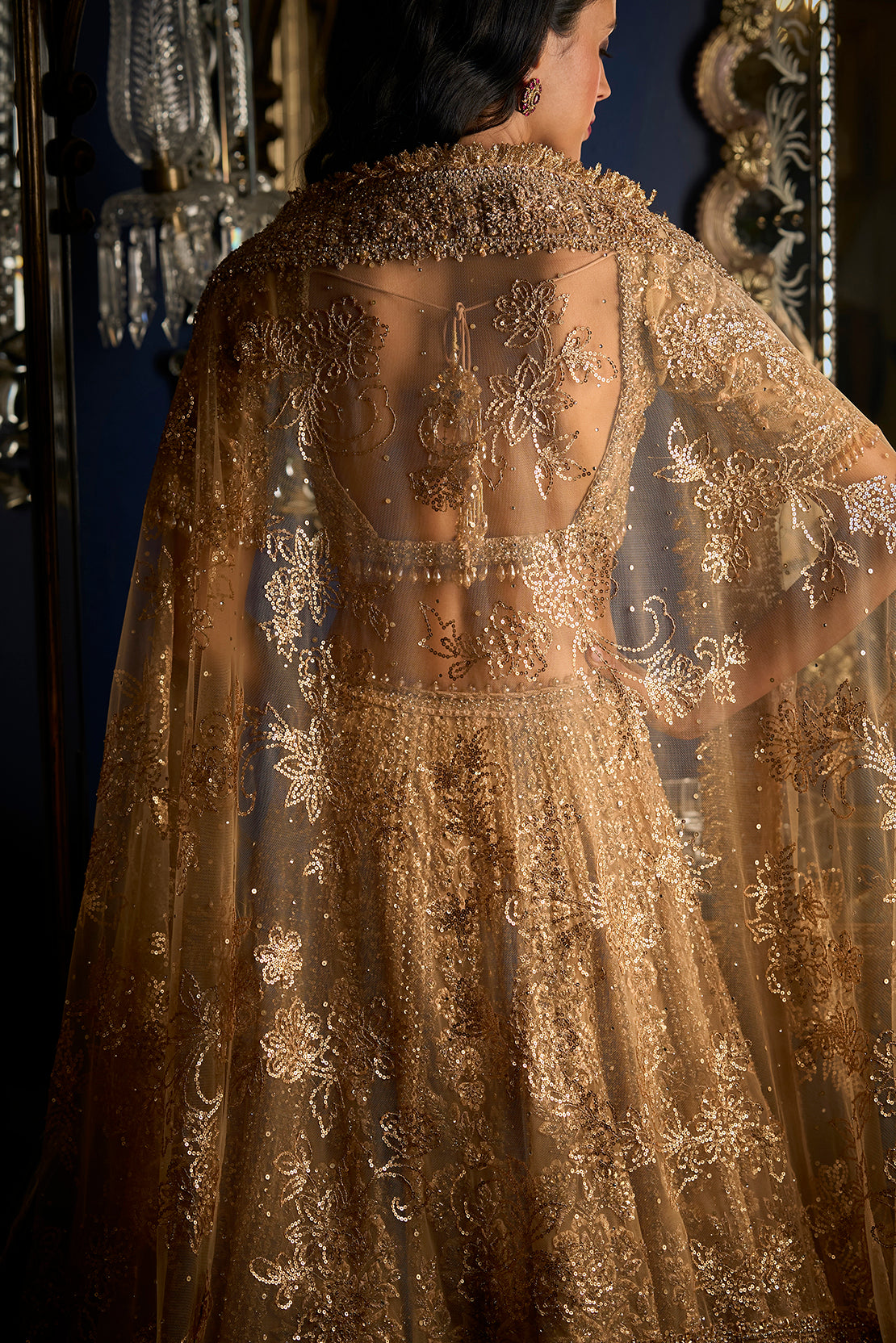 This copper lehenga set features intricate embroidery in copper thread, sequin and glass beads. The blouse shows crystal drops at the elbow and the waist. It is paired with four-sided embroidered dupatta..