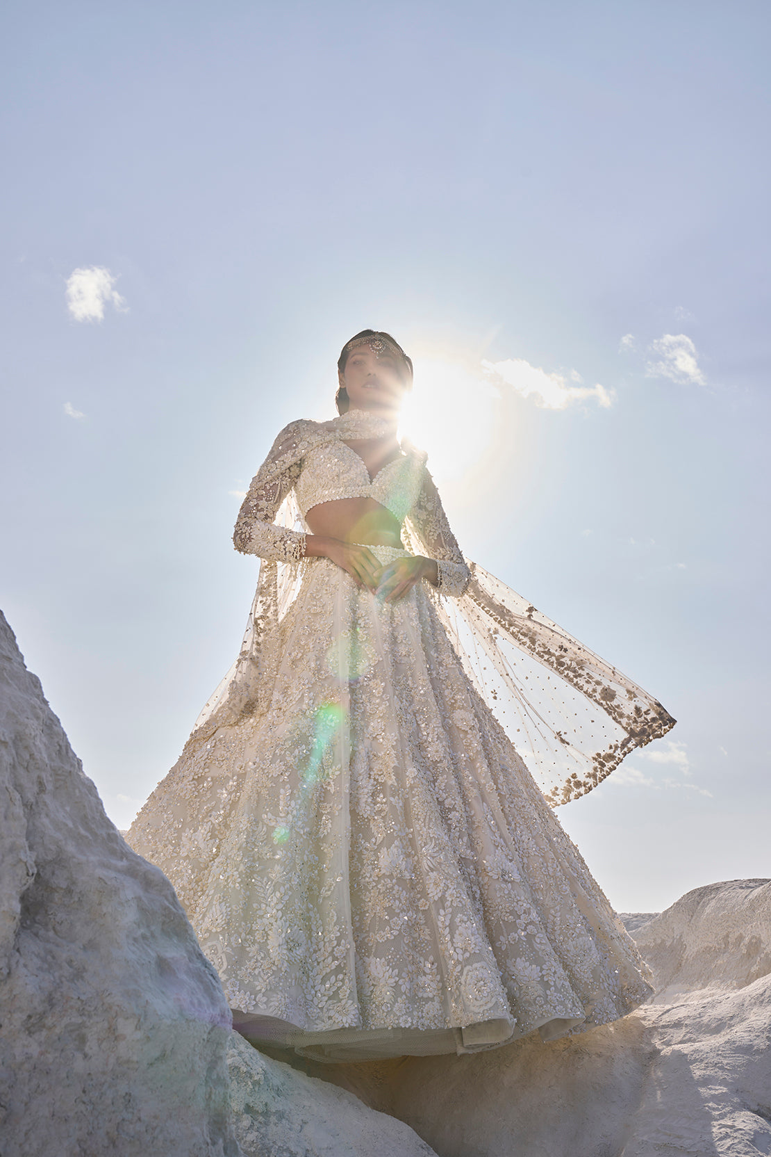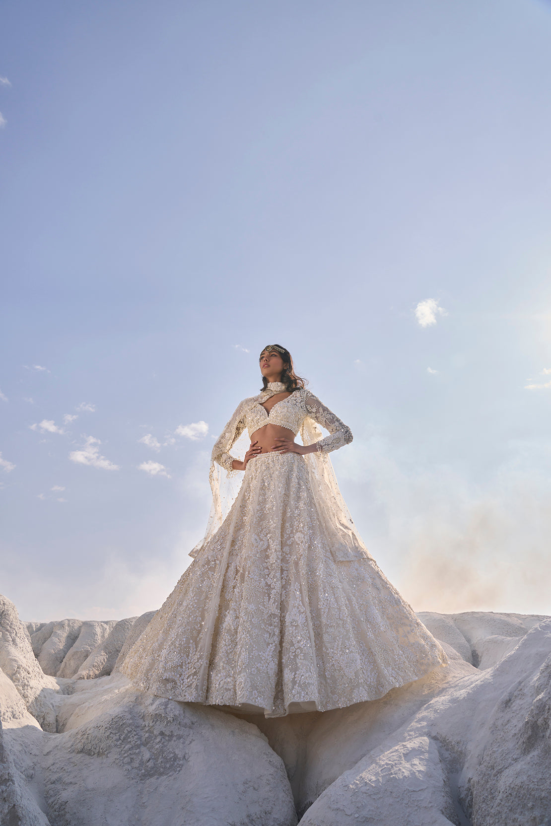 This lehenga set features all over three-dimensional embroidery in assorted fabrics, pearl, sequins etc. The blouse has a plunging neckline and pearl tassels at the hem and it is paired with four sided embroidered dupatta.