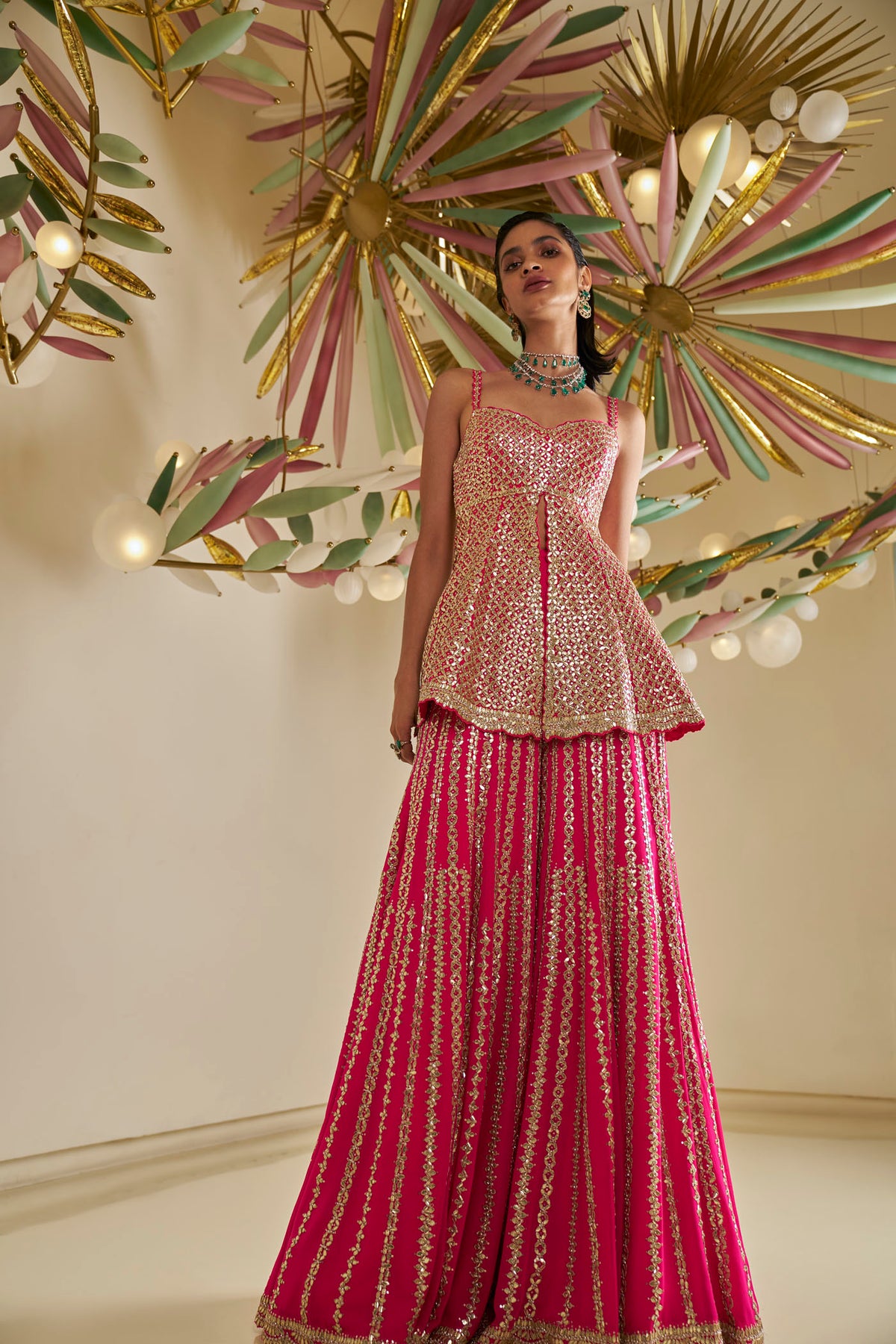 This sharara set features intricate gota patti embroidery on fuchsia georgette base. The peplum top is paired with a flowy sharara and four sided embroidered dupatta.