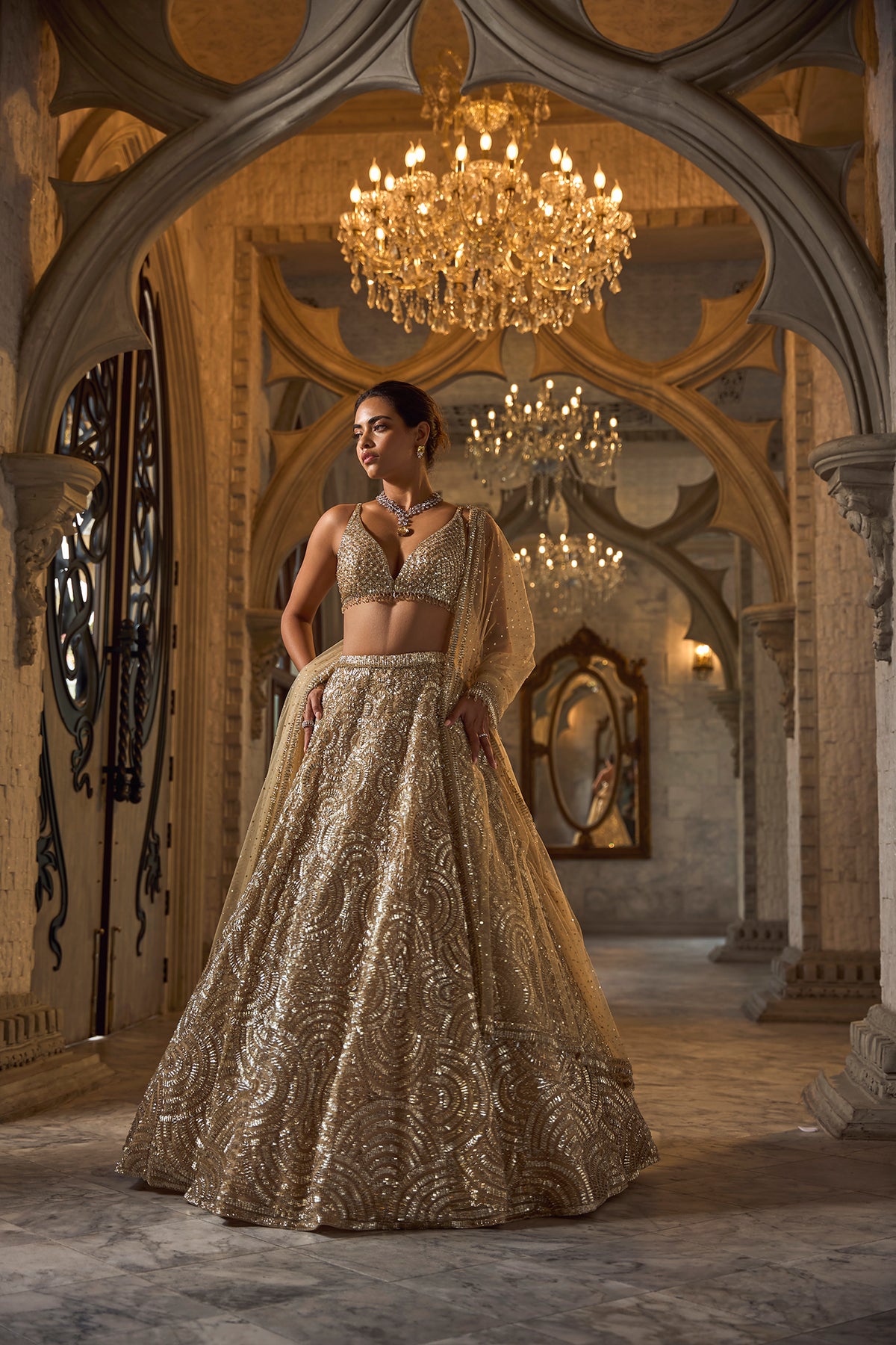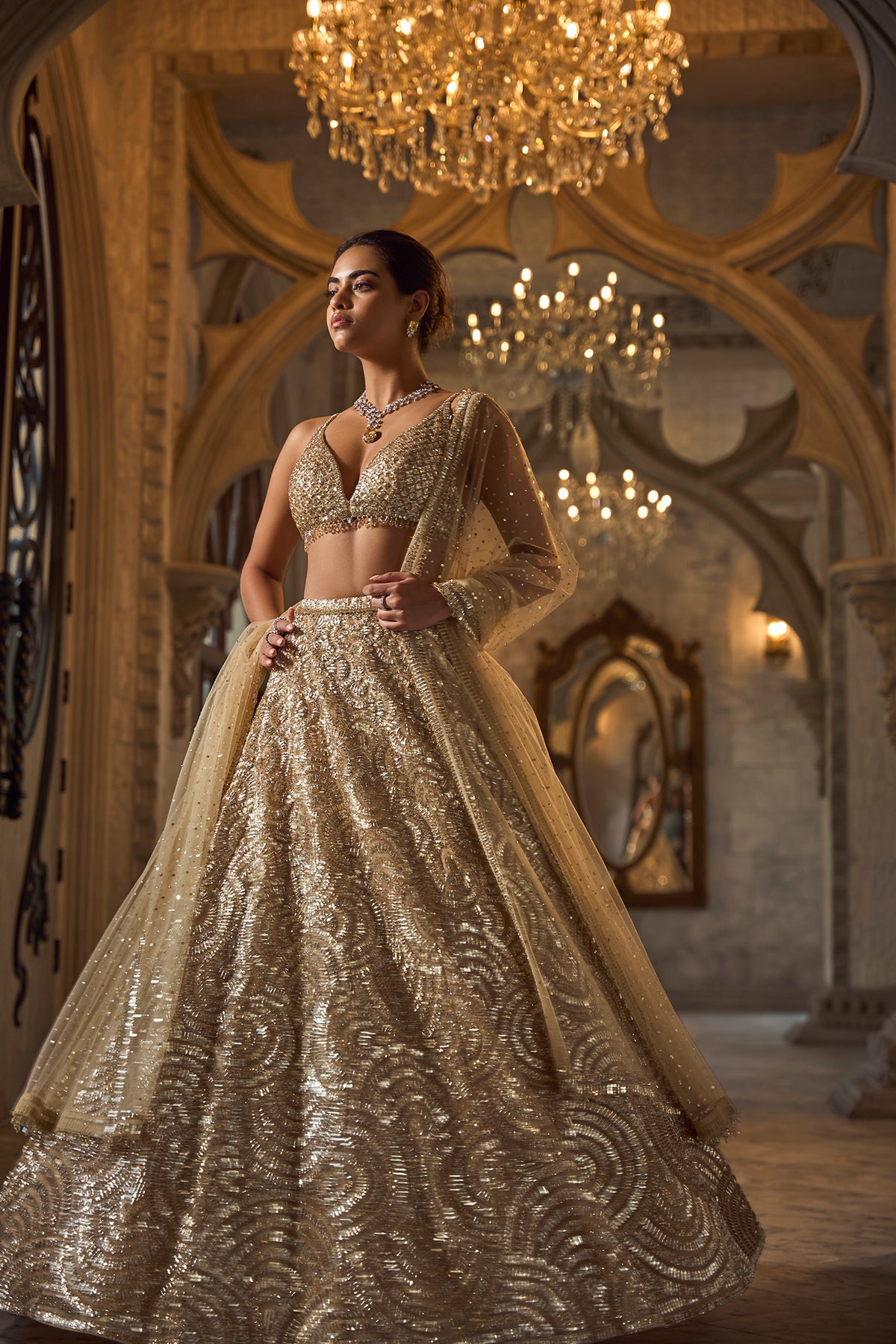 This lehenga set features gold sequin embroidery in a geometric pattern. The blouse has a plunging neckline and shows crystal tassels at the waist. Embroidered dupatta also shows crystal tassels on all four sides.