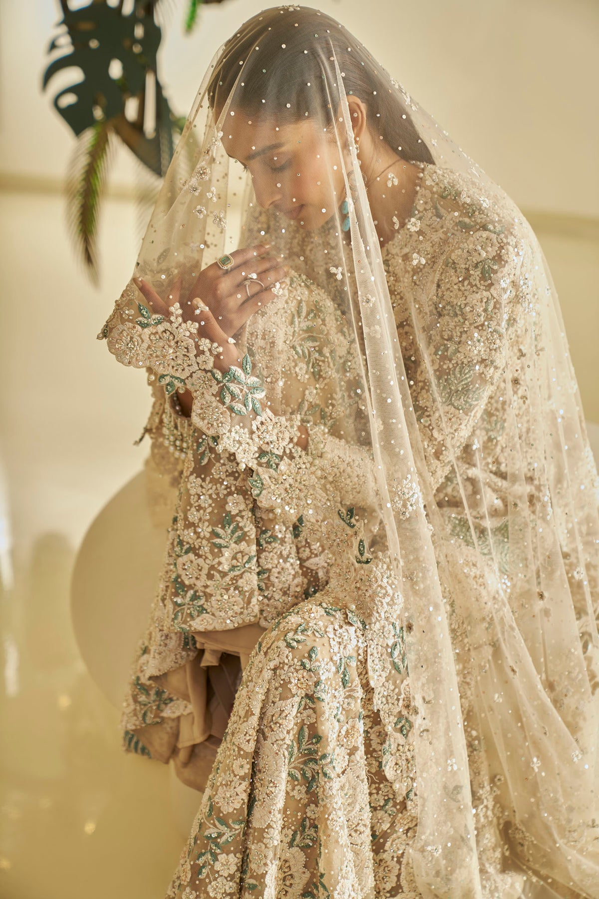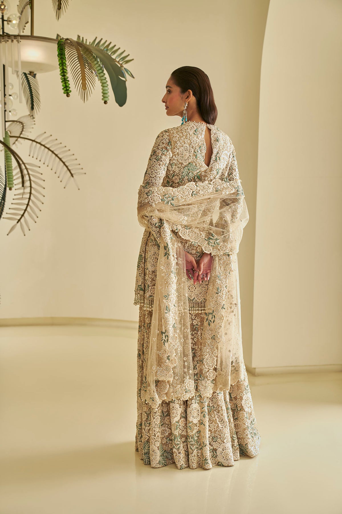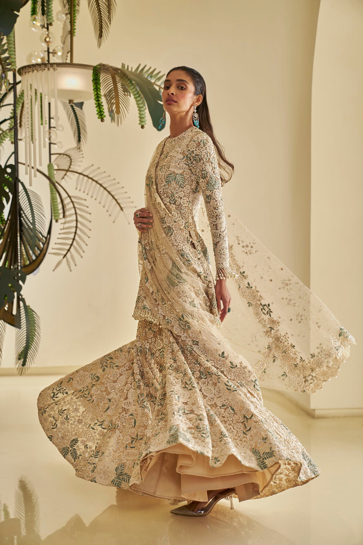 This sharara set features heavy thread embroidery in tones of ivory and sage green this is further insinuated with pearls and beads. It is paired with full embroidered sharara and a matching dupatta.