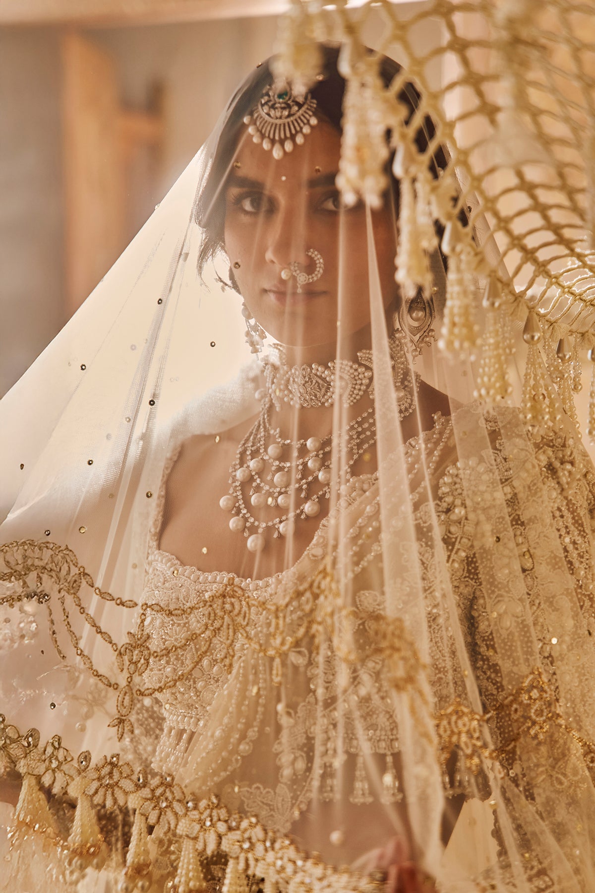 This lehenga set features intricate pearl and crystal embroidery interspersed with delicate tassels on a nude net base. The full sleeves embroidered blouse shows pearl tassels on the forearm and at the wrist It is paired with a embroidered scalloped matching dupatta with pearl tassels on all four sides. The ensemble can be styled with an optional veil, pearl kalira set and fully embroidered pearl chaadar.