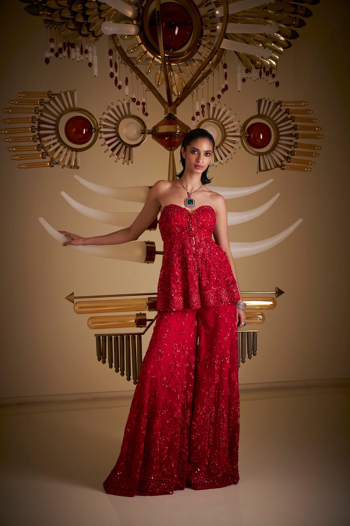 This sharara set features tonal three-dimensional embroidery in sequin and bead. The off-shoulder peplum top is paired with a four sided embroidered dupatta.