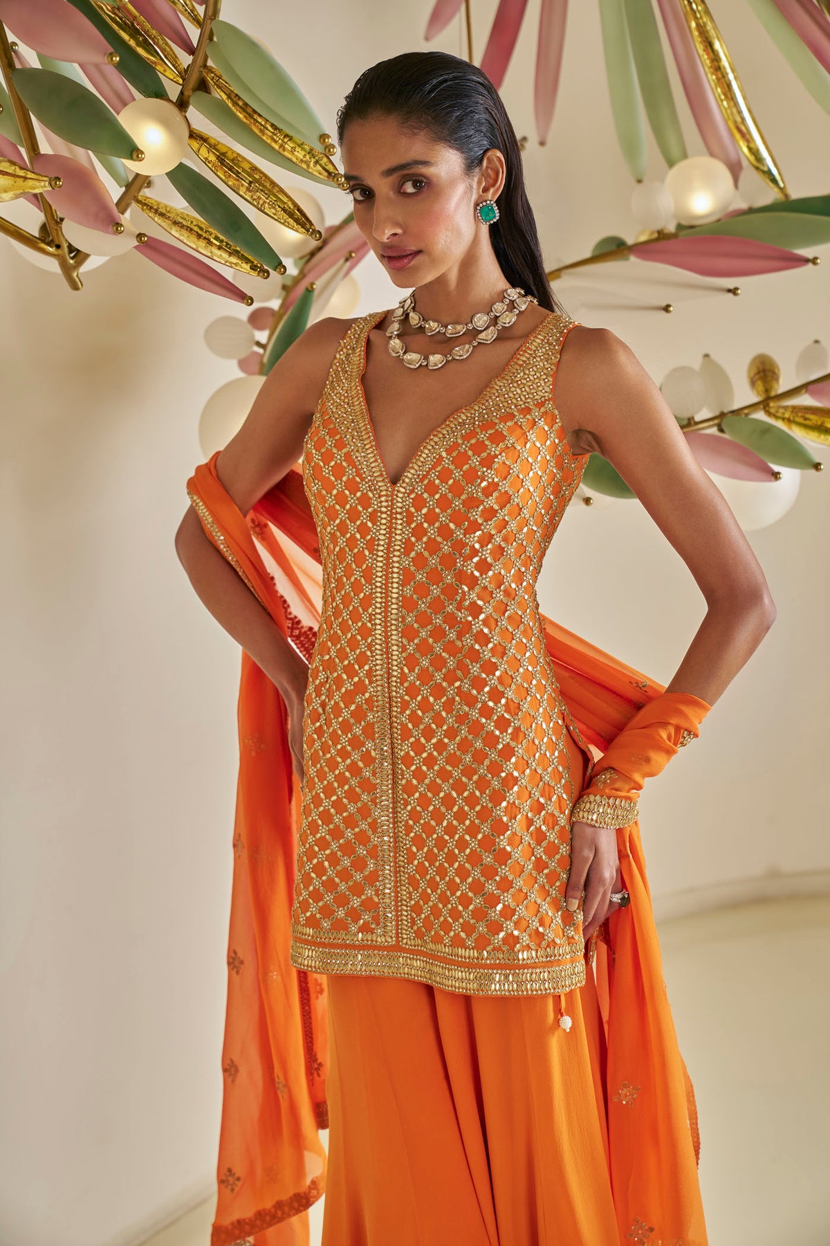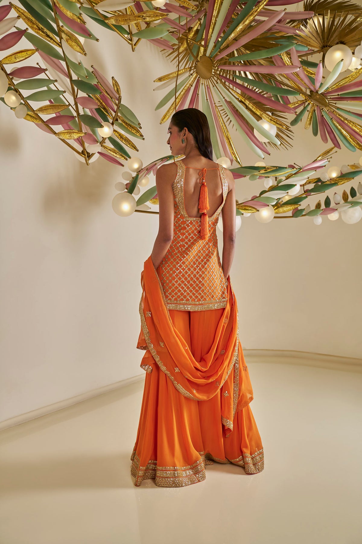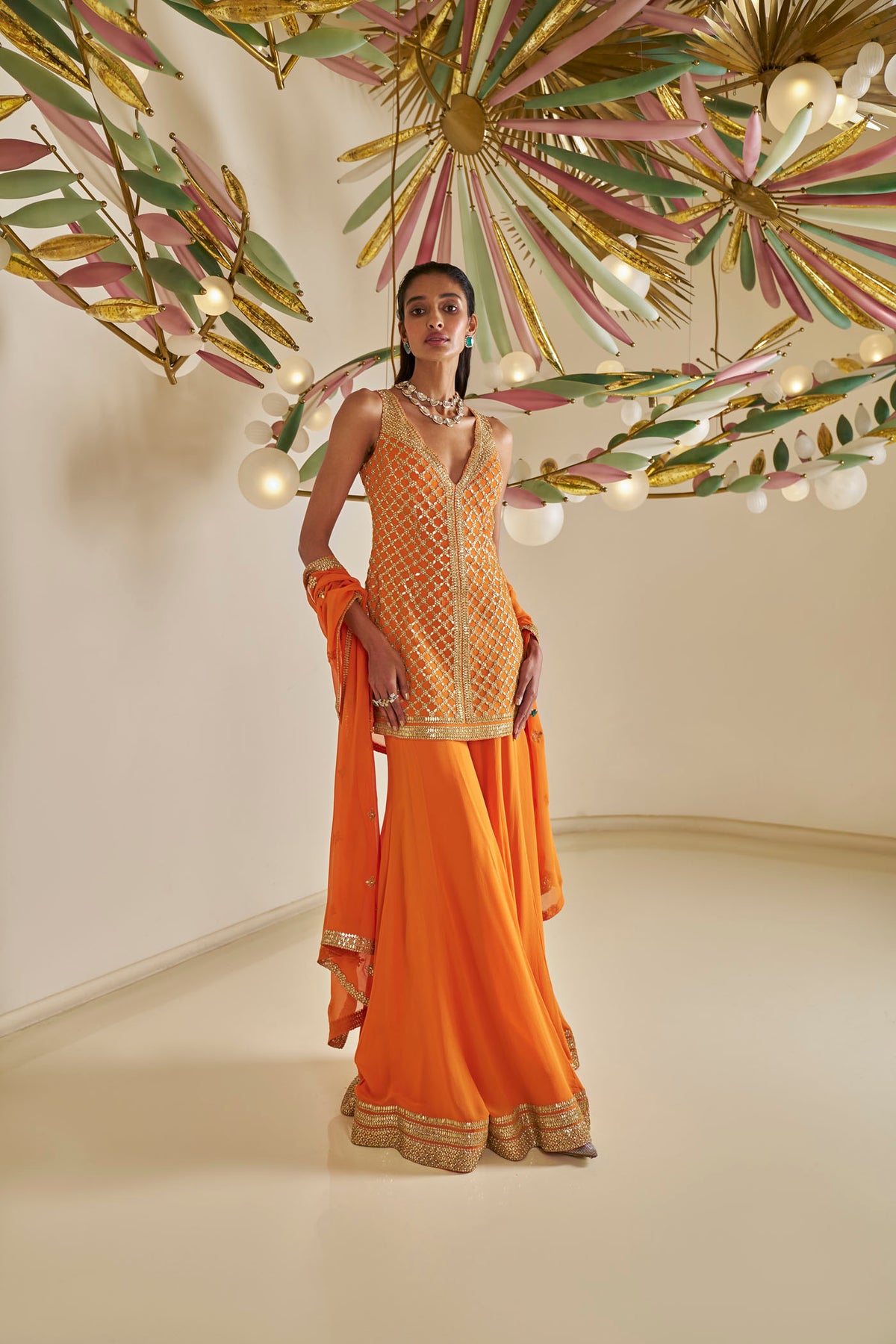 This sharara set features intricate gota patti embroidery on orange georgette base. The fully worked top is paired with a flowy sharara and four sided embroidered dupatta.
