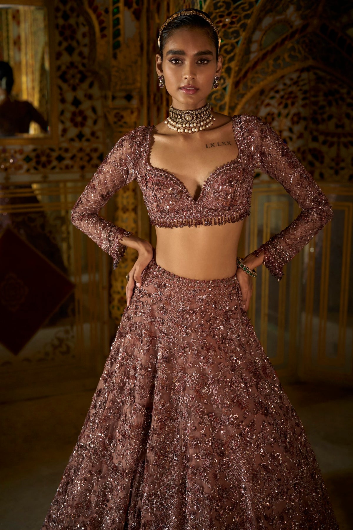 This lehenga set features intricate embroidery in crystal, beads and sequin on a plum net base. The full sleeve blouse shows tassels at the wrist as well as at the waist. The back of the blouse has exaggerated tassels in crystals and beads. The matching dupatta has scalloped border with tassels.