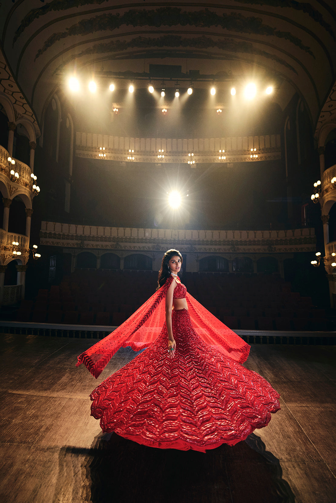 This red lehenga set features all over tonal sequin embroidery in a leaf like pattern. The outfit is paired with a strappy blouse and a four sided embroidered net dupatta.